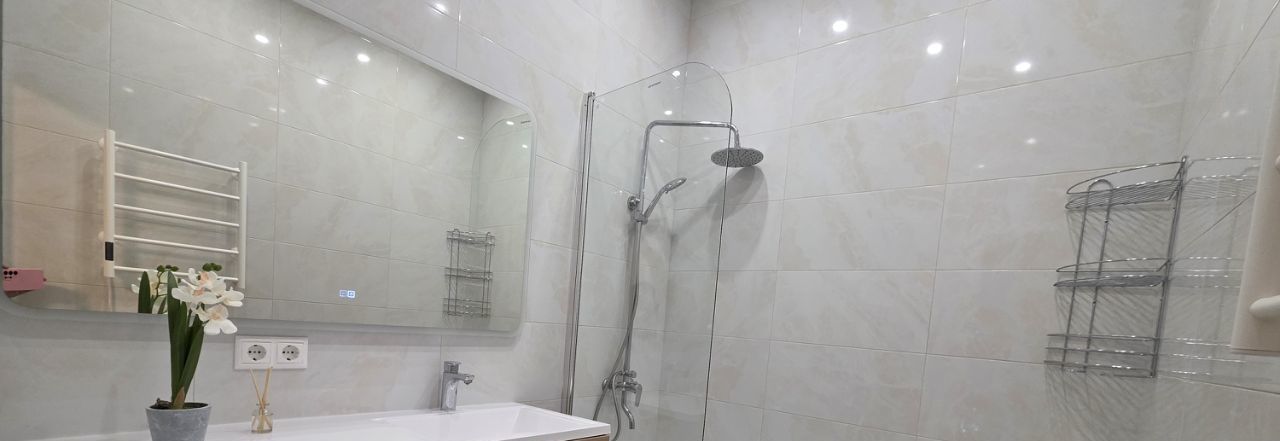 Просторная ванная комната оснащена большим зеркалом с подсветкой и стильной стеклянной перегородкой, создавая атмосферу роскоши и комфорта.
