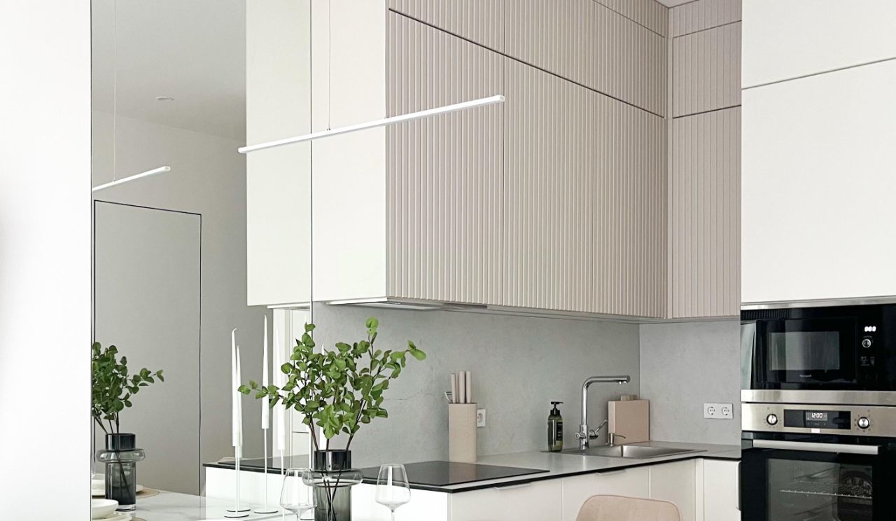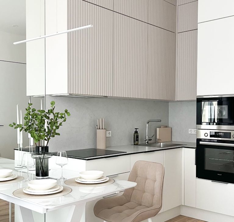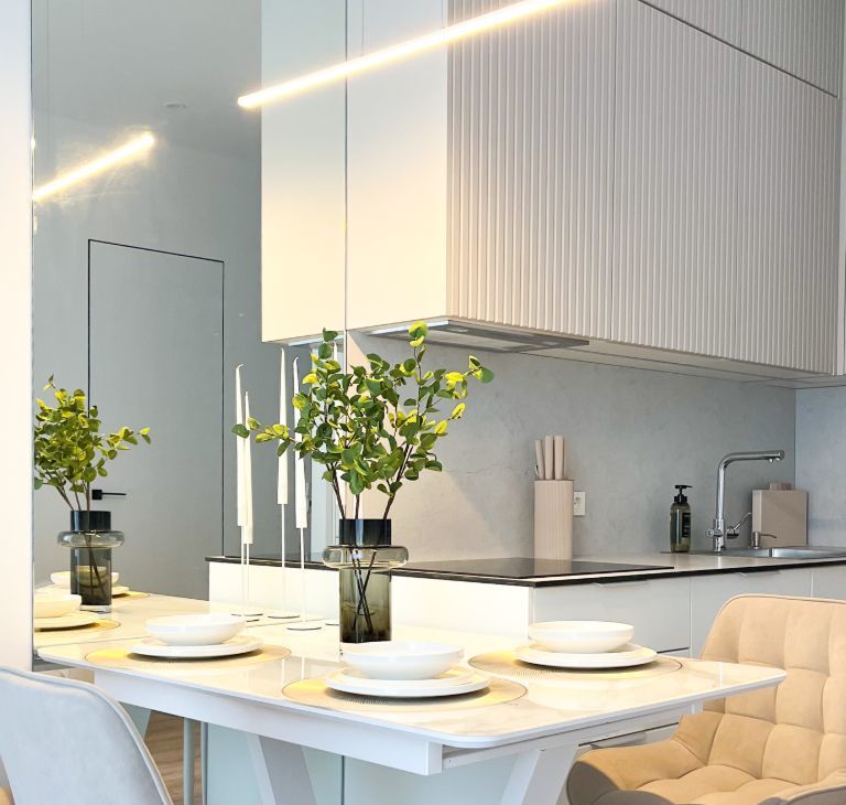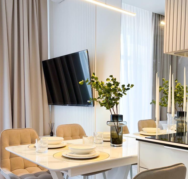 Просторная кухня-гостиная ( высота потолков 3 м) укомплектована современной кухонной мебелью, встроенной посудомоечной машиной, холодильником, чайником, посудой , кухонными принадлежностями и установленным в марте 2026 фильтром для воды.