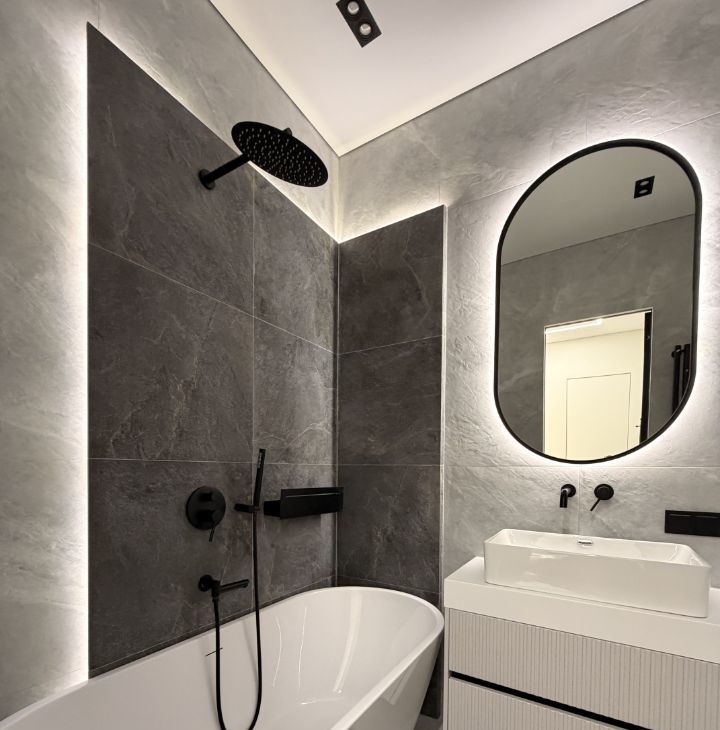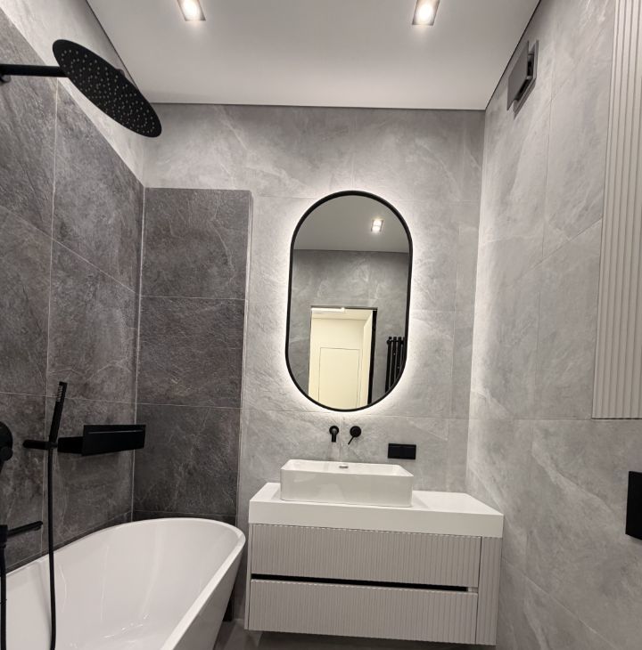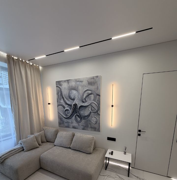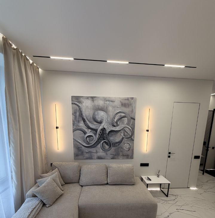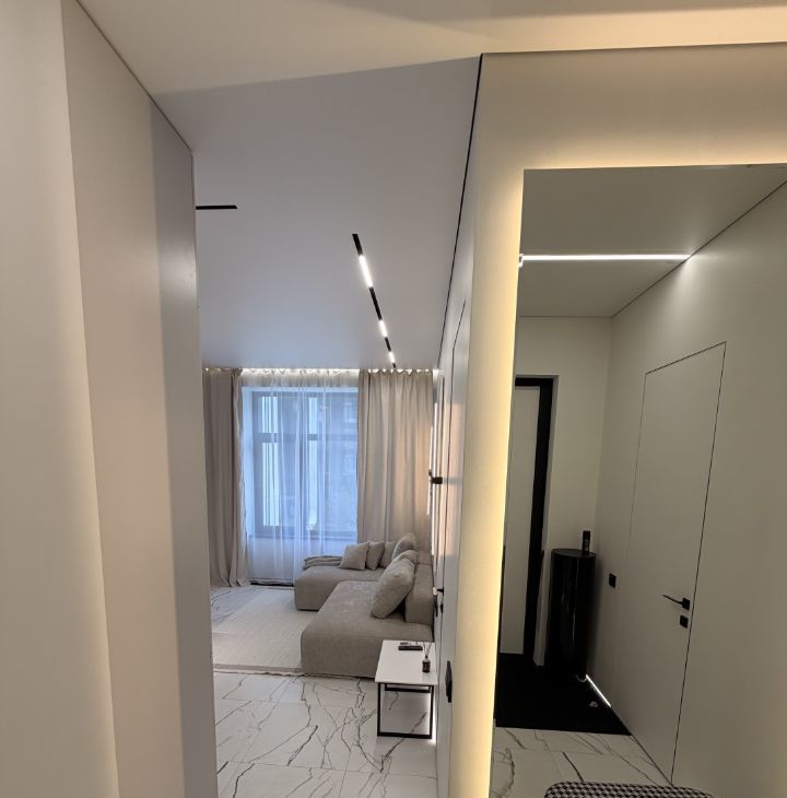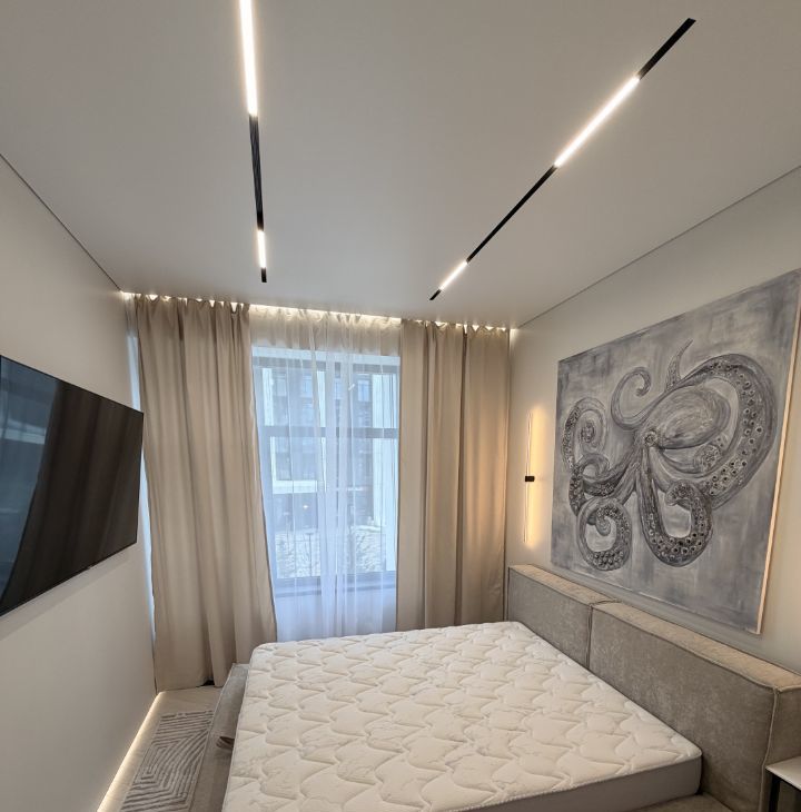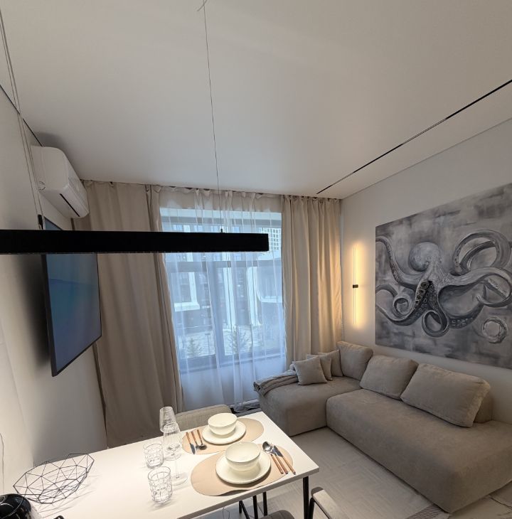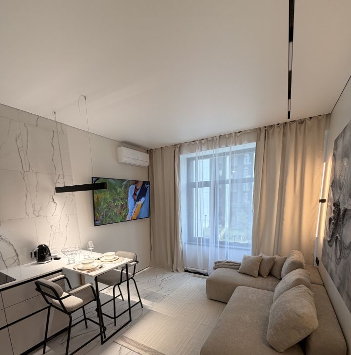 Квартира с дизайнерским ремонтом включает в себя просторную кухню 18 кв. м и жилую зону 25 кв. м. В квартире есть вся необходимая техника: кондиционер, холодильник, посудомоечная машина, телевизор и стиральная машина. Мебель установлена как на кухне, так и в комнате, поэтому можно сразу заселиться и жить с комфортом. Санузел совмещенный, оборудован ванной. Окна выходят как на улицу, так и во двор.
