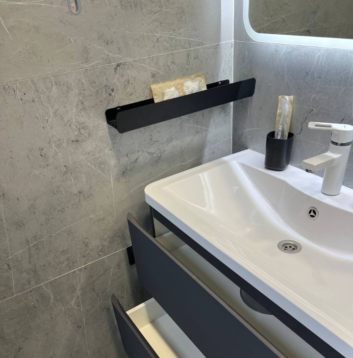 - Комфортная ванная комната с подвесной сантехникой, тропическим душем и витражной вентиляцией.