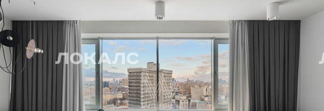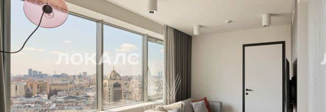 Планировка: гостиная с кухней-нишей и обеденной зоной, спальня с гардеробной и ванной комнатой, гостевой санузел, холл. Апартамент полностью укомплектован мягкой мебелью и бытовой техникой. Из окон открывается панорамный вид на центр города и Новый Арбат.