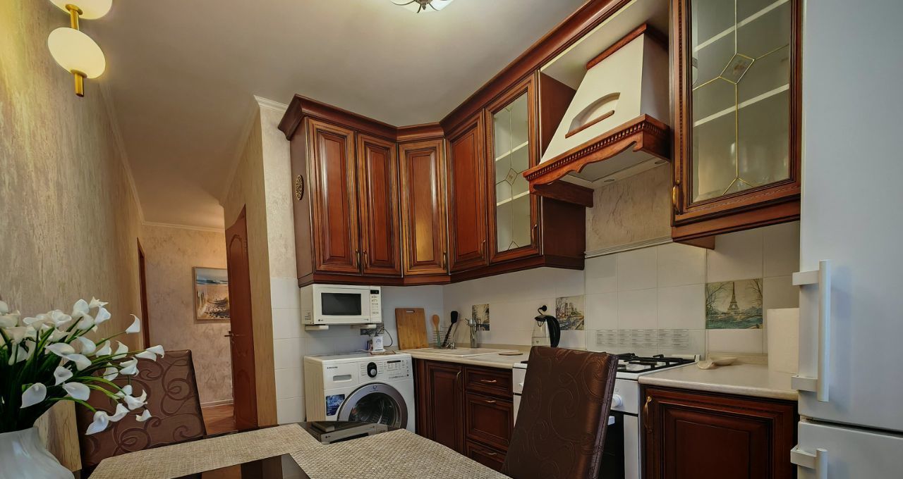 холодильник, стиральная машина (7 кг), газовая плита с духовкой, СВЧ, телевизор, интернет, , стационарный фильтр для чистой питьевой воды, чайник, утюг, гладильная доска.
