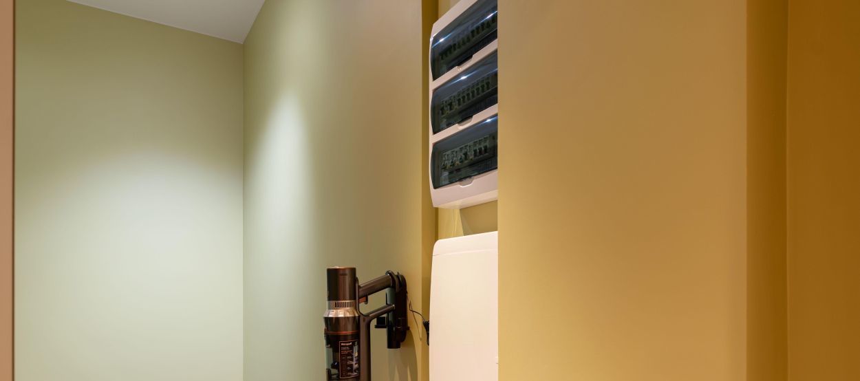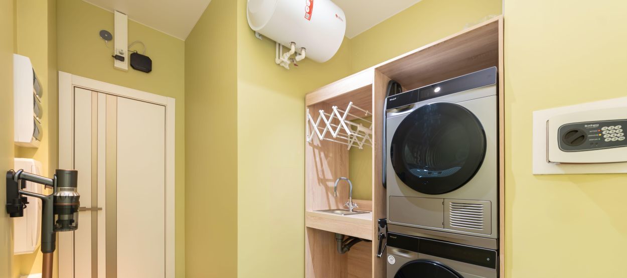 Просторная кладовая оборудована стиральной и сушильной машинами, гладильной доской, раздвижной сушилкой для мелких вещей, аккумуляторным пылесосом. В этом же помещении расположены электрощиты, оборудованные всеми современными системами электробезопасности, бойлер для автономного подогрева воды, подключённый к сети водоснабжения, интернет-роутер и небольшой сейф. Оставшаяся свободная площадь позволяет установить дополнительные системы хранения или оборудовать большую гардеробную.