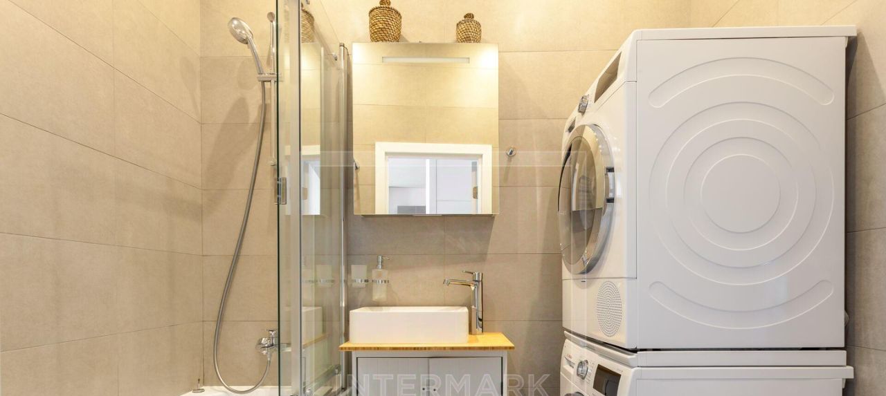 В квартире: С мебелью, М/место в подземном паркинге, Посудомоечная машина, Стиральная машина, Сушильная машина, Бойлер, Теплые полы, Спутниковое/кабельное телевидение, Кондиционер, Видеонаблюдение, Охрана, Пожарный выход, Интернет, Видовая квартира, Европланировка, Ванна, Интерьер в современном стиле, Консьерж, Апартаменты, Гардеробная комната, Лифт, Ремонт - дизайнерский, Кухонная мебель, Окна на улицу, Окна во двор