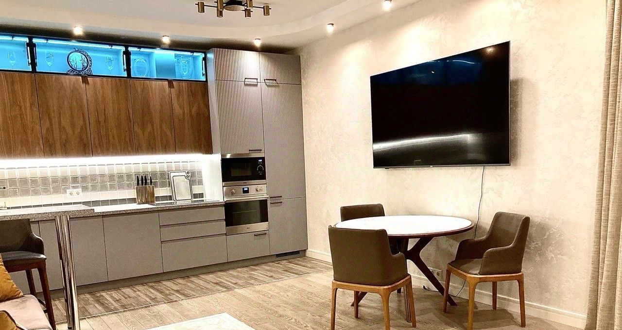 В гостиной - многоуровневая подсветка, комфортный диван, телевизор, обеденная группа- стол и кресла.