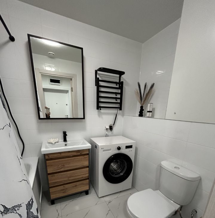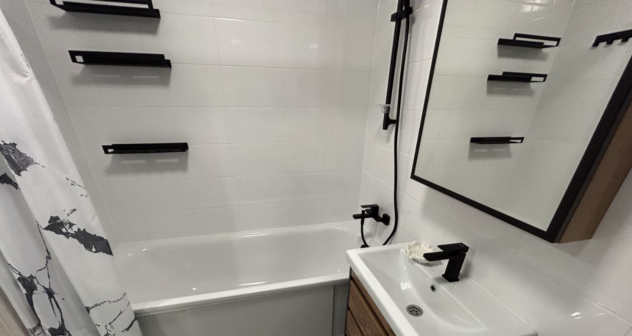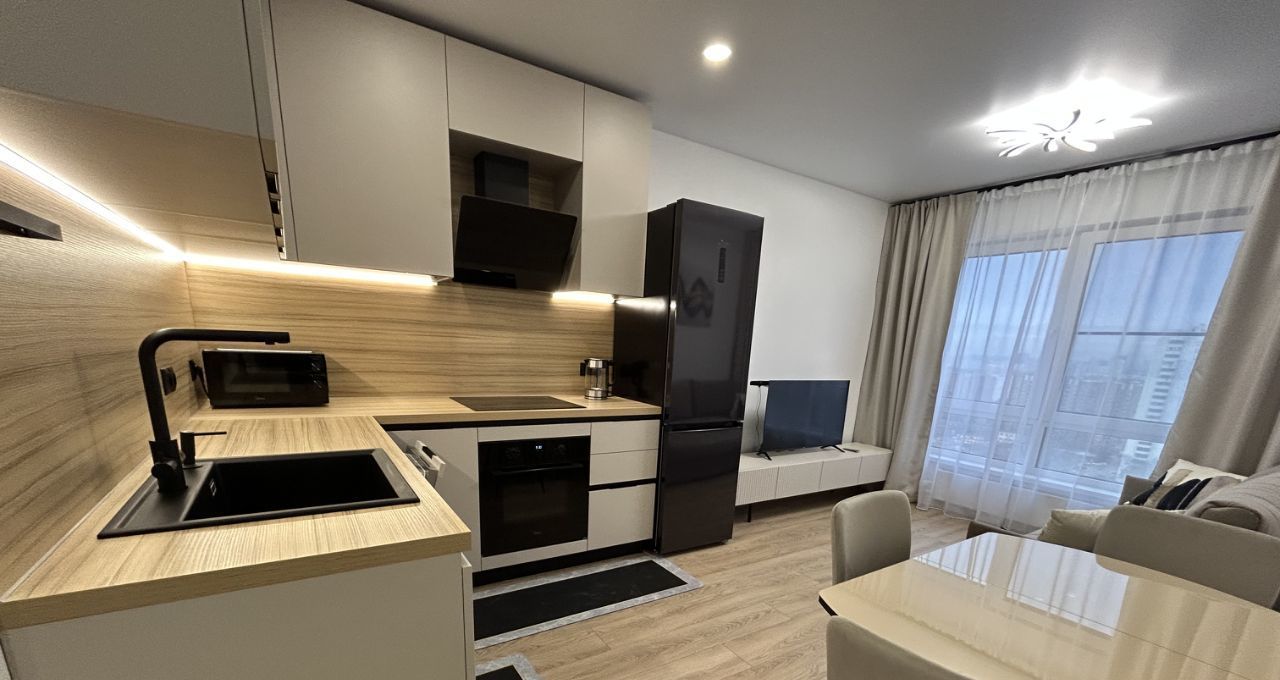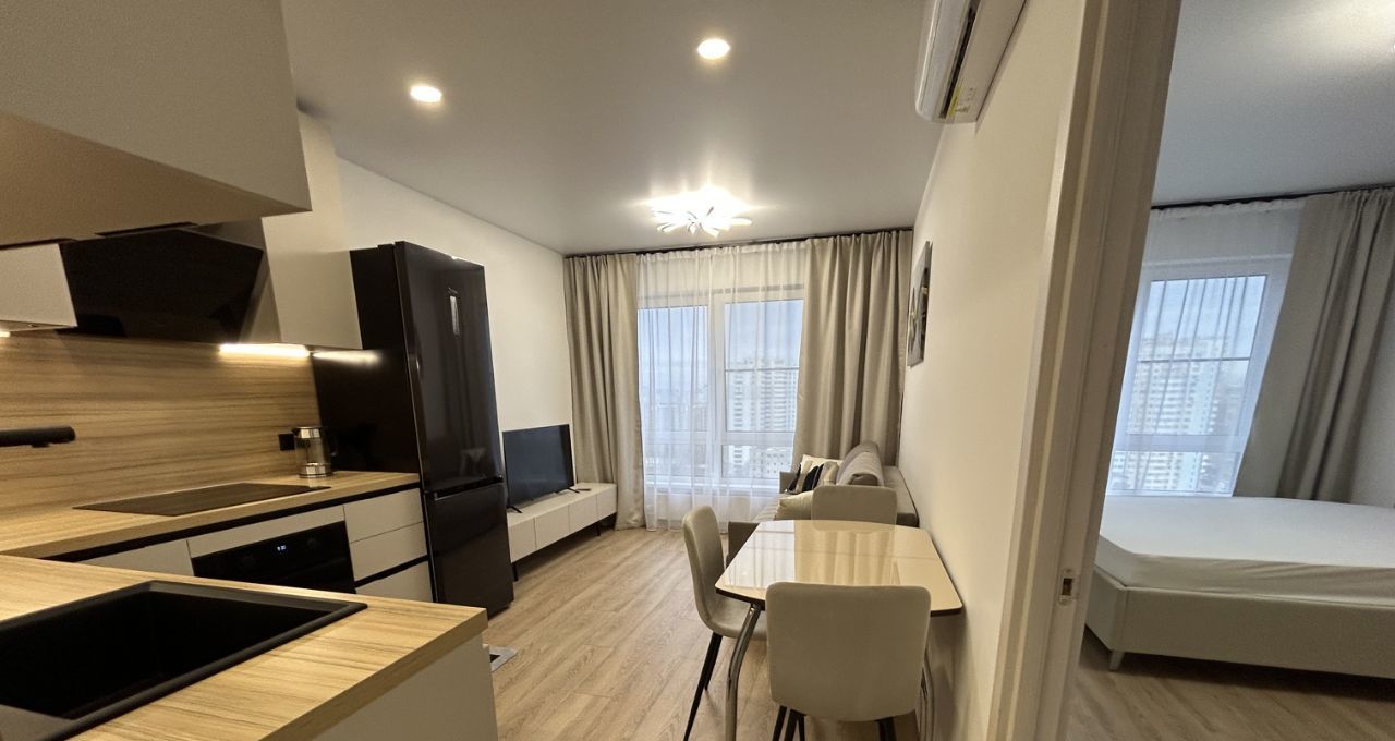 В квартире выполнен евроремонт, поэтому всё выглядит стильно и современно. Здесь есть необходимая мебель на кухне и в комнате, а также вся необходимая техника: кондиционер, холодильник, посудомоечная машина, телевизор, стиральная машина. Санузел совмещённый, оборудован ванной. Интернет подключен, поэтому можно сразу работать или отдыхать онлайн.