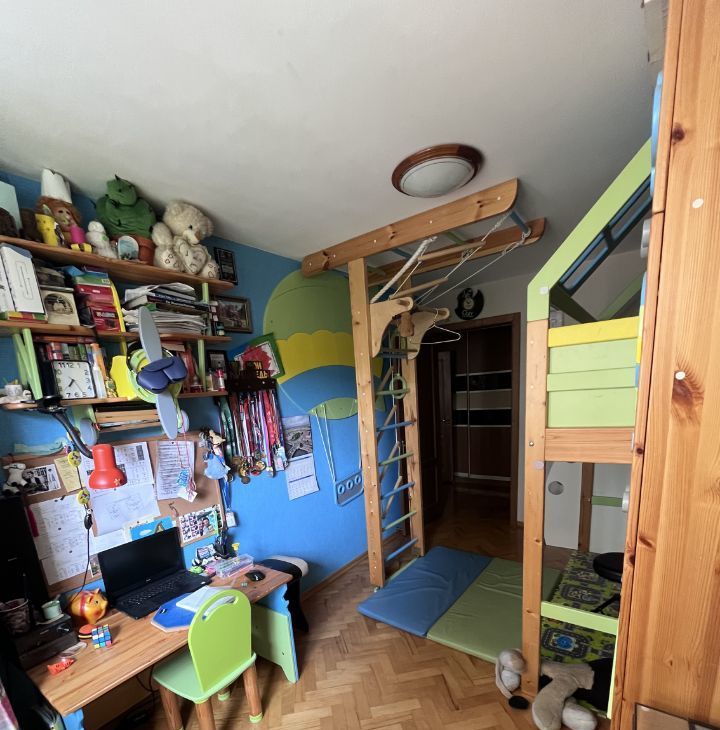 Отдельная детская комната полностью продумана для ребёнка: установлен дизайнерский гарнитур от Белка дизайн, выполненный под заказ. В составе — рабочее место, система хранения, зона отдыха и спортивный комплекс, всё в едином стиле с яркими акцентами, с учётом эргономики и безопасности, поэтому новой семье не придётся дополнительно заниматься оформлением детской.