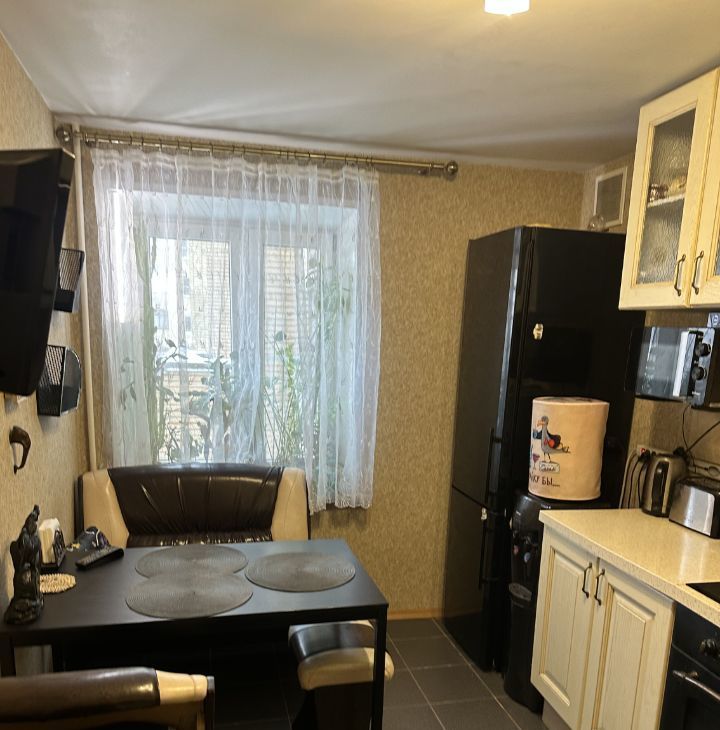 Кухня 9,4 кв. м оформлена как полноценная кухнястоловая: угловой кухонный гарнитур, удобная обеденная зона с диваном и столом, достаточно мест для хранения, всё размещено эргономично. Здесь комфортно и готовить, и собираться всей семьёй за ужином.
