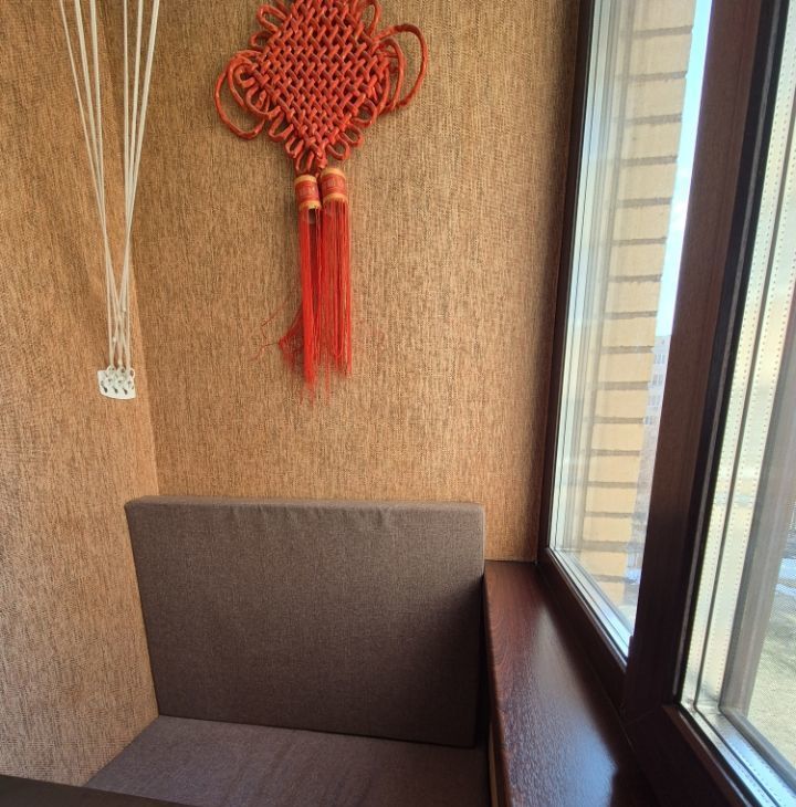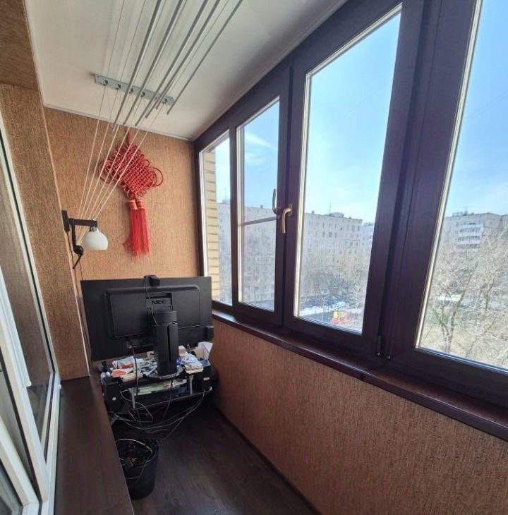 Закрытая лоджия с двойным стеклопакетом Deceuninck (тёмный дуб) утеплена и обустроена под удобное офисное пространство — идеальное место для удалённой работы или учебы.