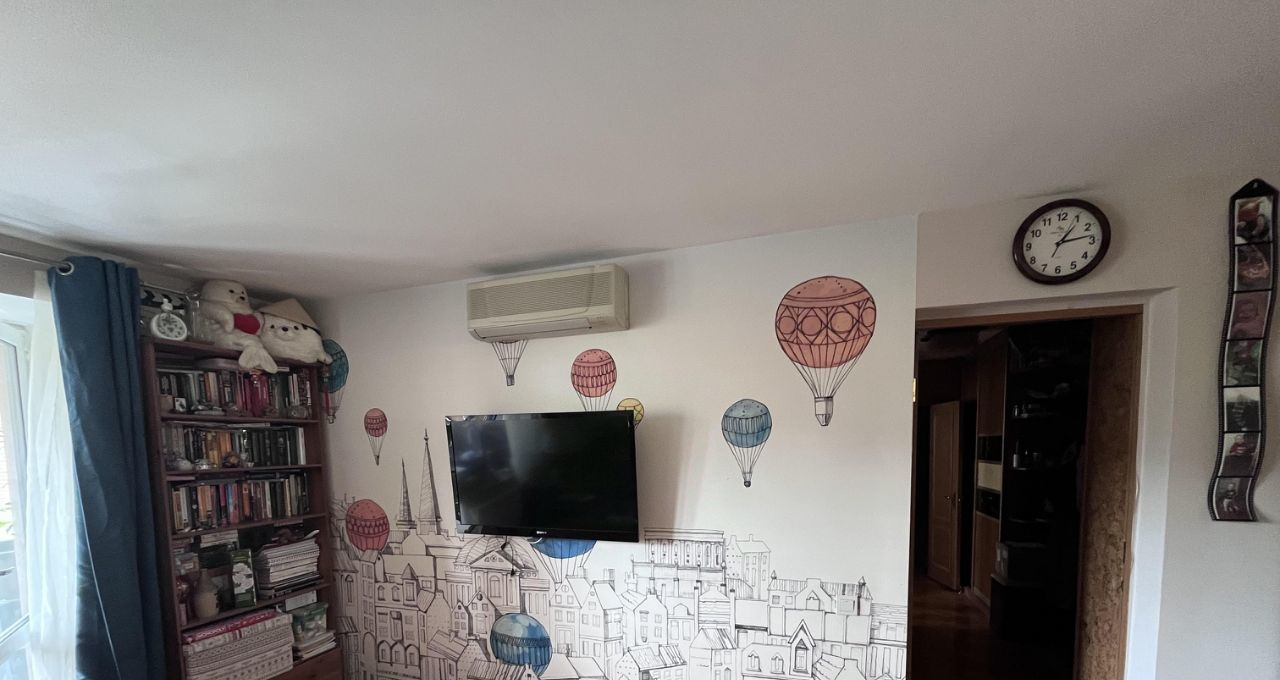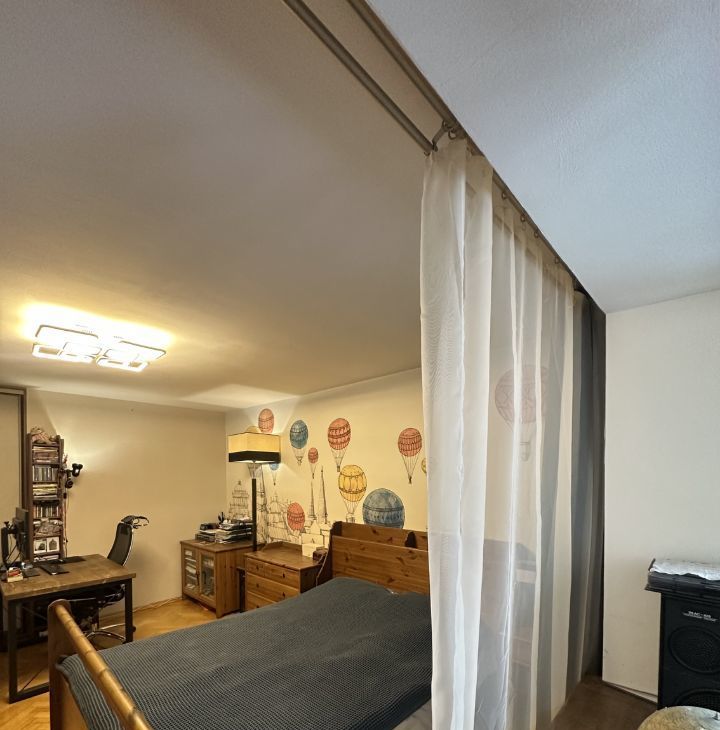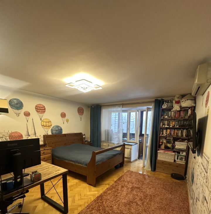 Просторная комната сейчас зонирована под спальню и домашний кабинет: двуспальная кровать, большой рабочий стол с местом под компьютер, выход на утеплённую лоджию. В гостиной выполнен дизайнерский ремонт: акцентные две стены с авторскими обоями в воздушной тематике создают ощущение простора и лёгкости; мягкое потолочное освещение, текстиль в спокойных тонах и натуральный деревянный паркет добавляют комнате уюта, а расстановка мебели позволяет комфортно совместить зону отдыха и кабинет.