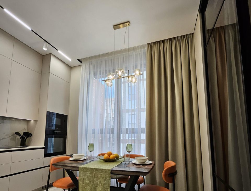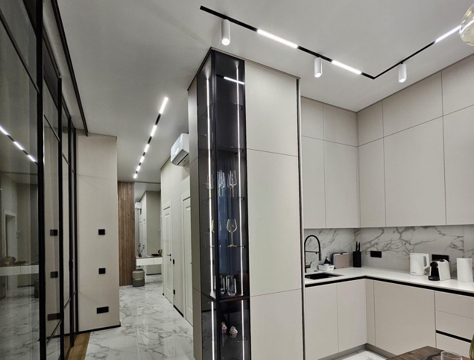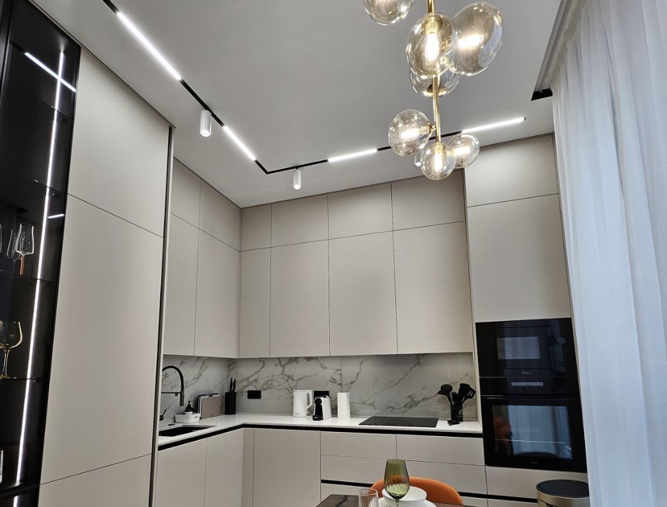 - кухонный гарнитур укомплектован всей необходимой техникой от ведущих брендов (Посудомоечная машина, индукционная варочная панель, холодильник, духовой шкаф, микроволновая печь, фильтр для питьевой воды, дробилка).
