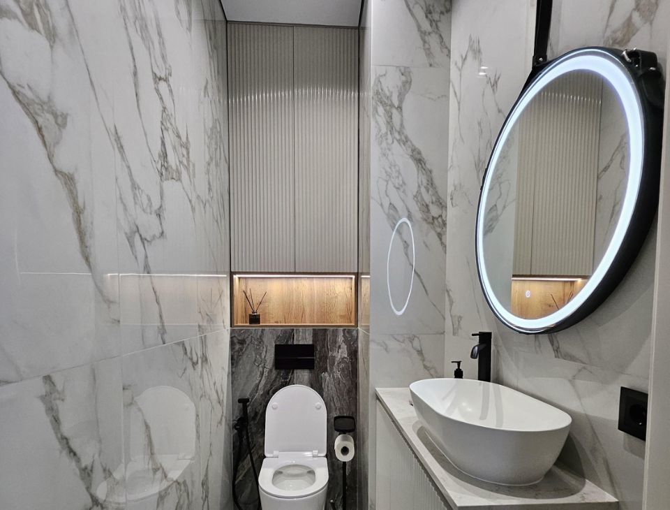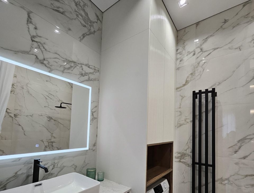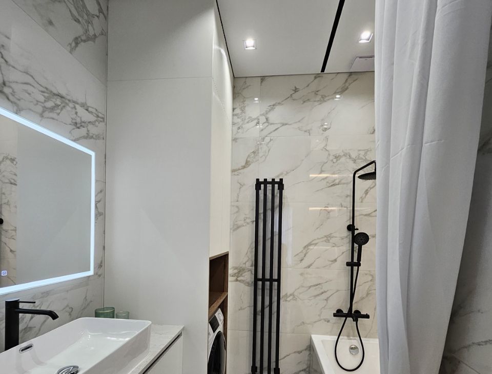 - раздельный санузел и ванная комната. Стирально-сушильная машина, проточный водонагреватель, гигиенический душ, аквастопы от протечки воды.