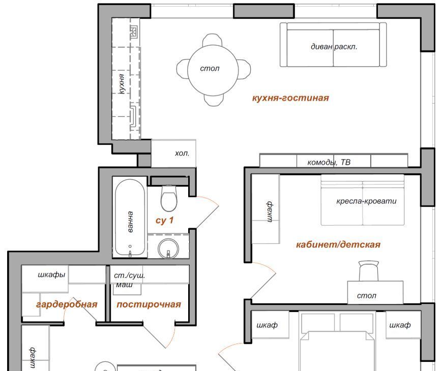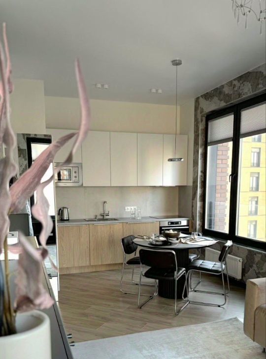 65 м²: кухня-гостиная, мастер-спальня, кабинет / детская, 2 санузла, гардеробная, отдельная постирочная.