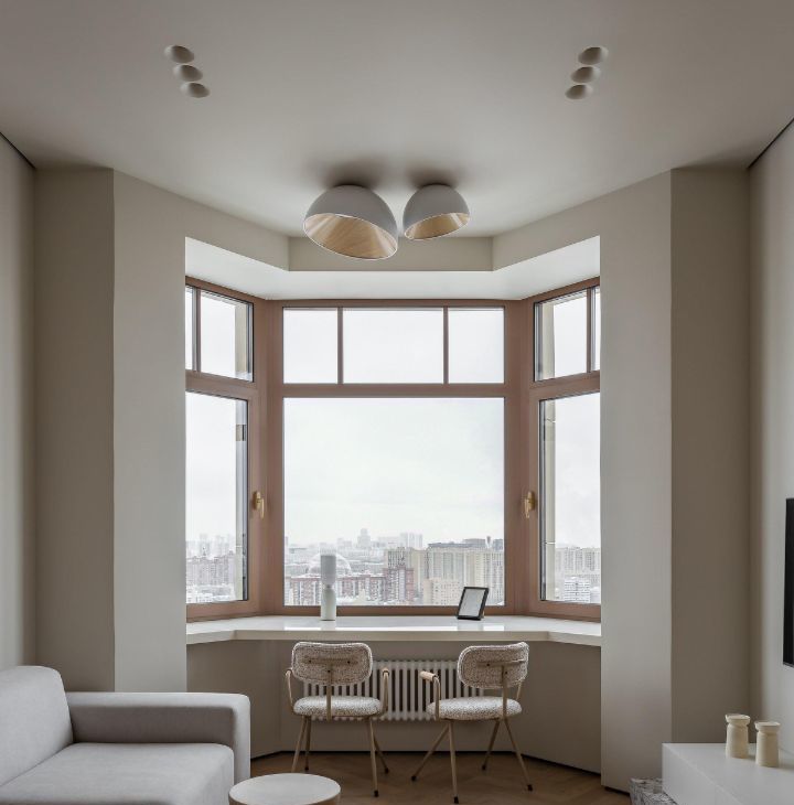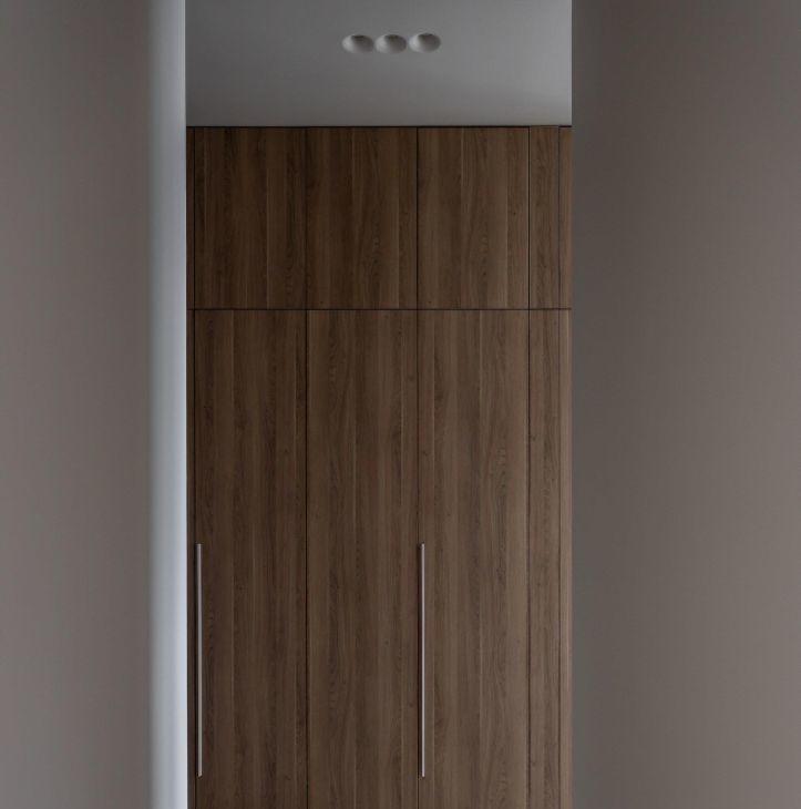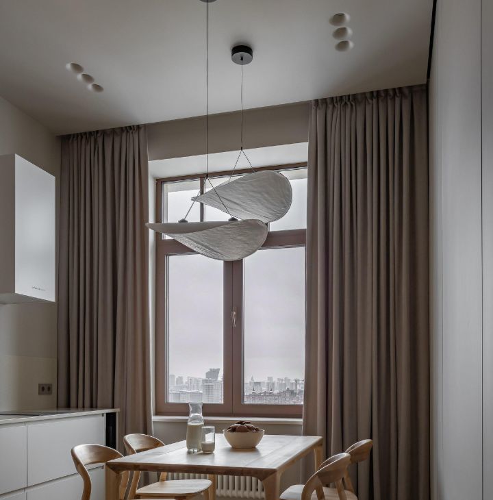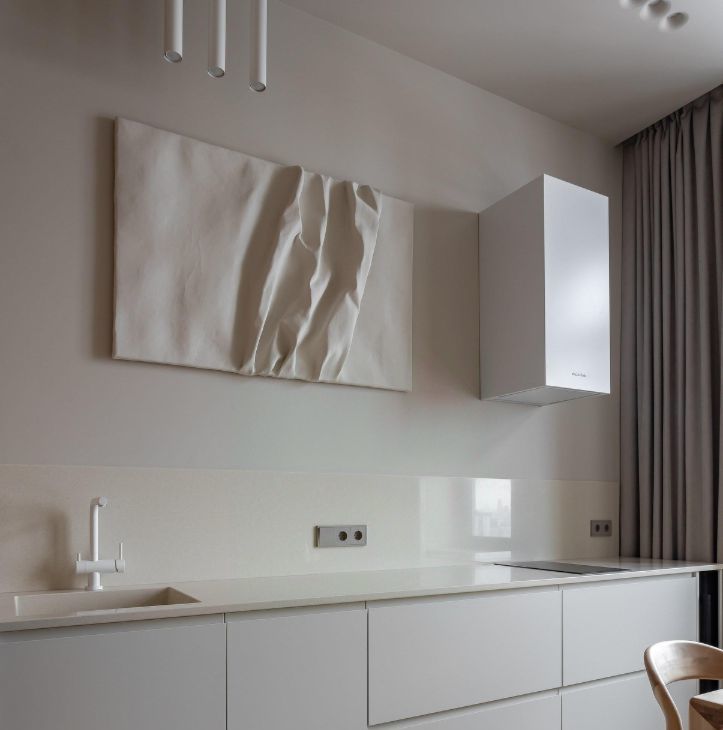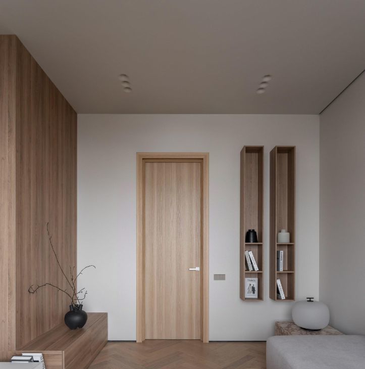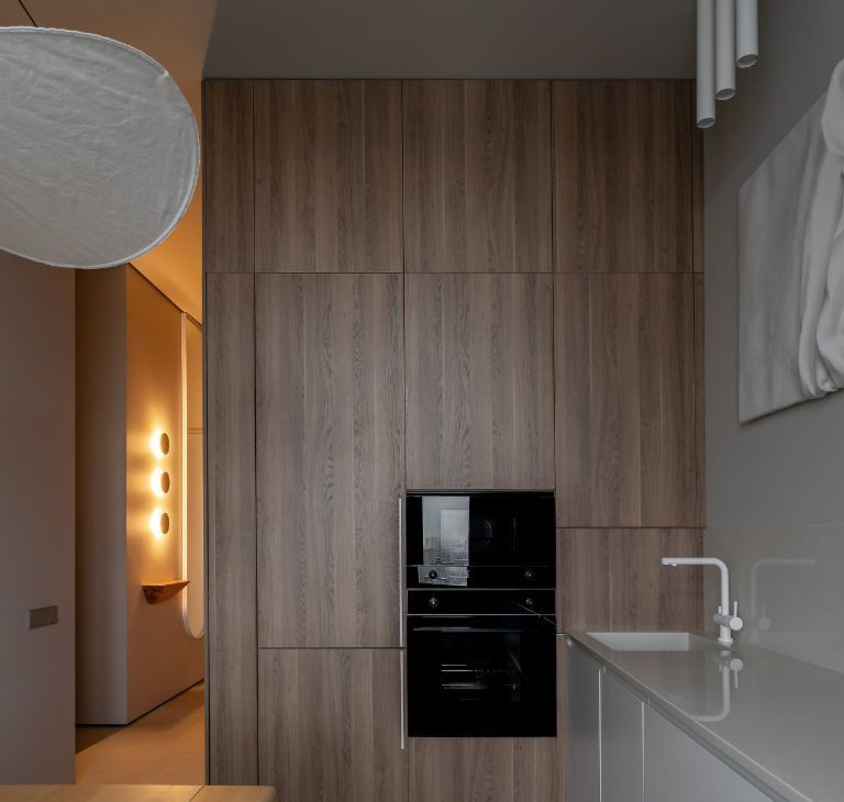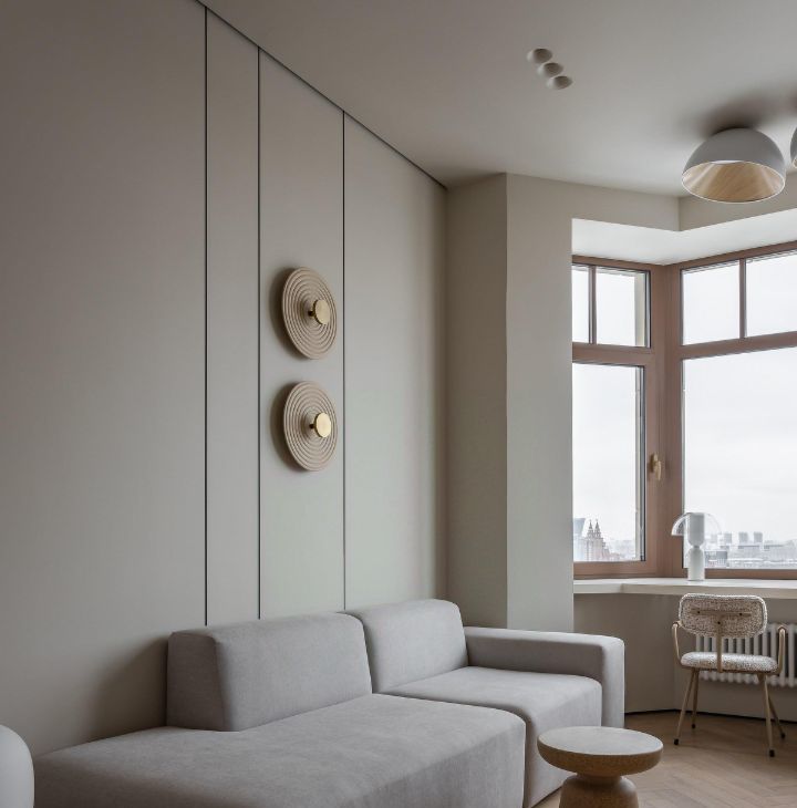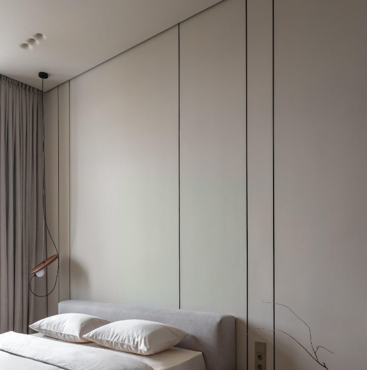 Интерьер выполнен в современном минималистичном стиле в спокойных благородных оттенках.