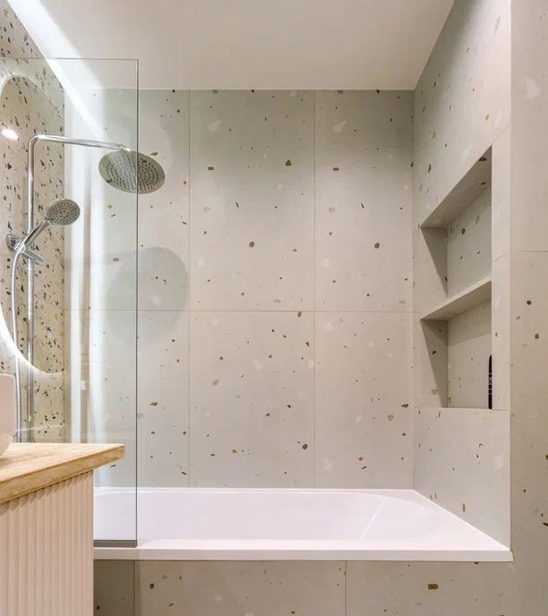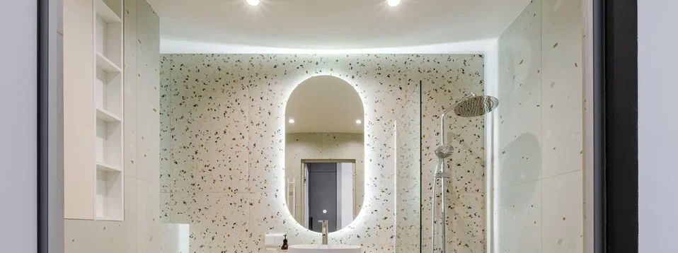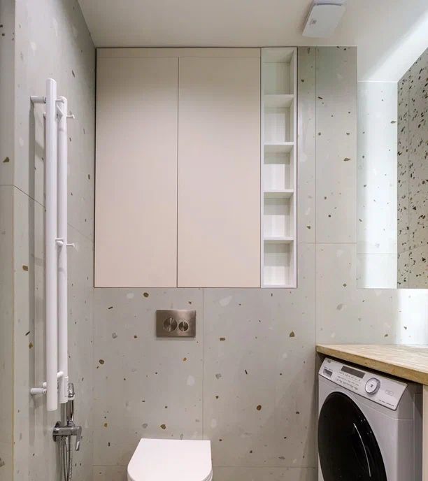 В просторной ванной комнате установлена стиральная машина с функцией сушки, зеркало с дополнительной подсветкой и теплая мраморная ванна.