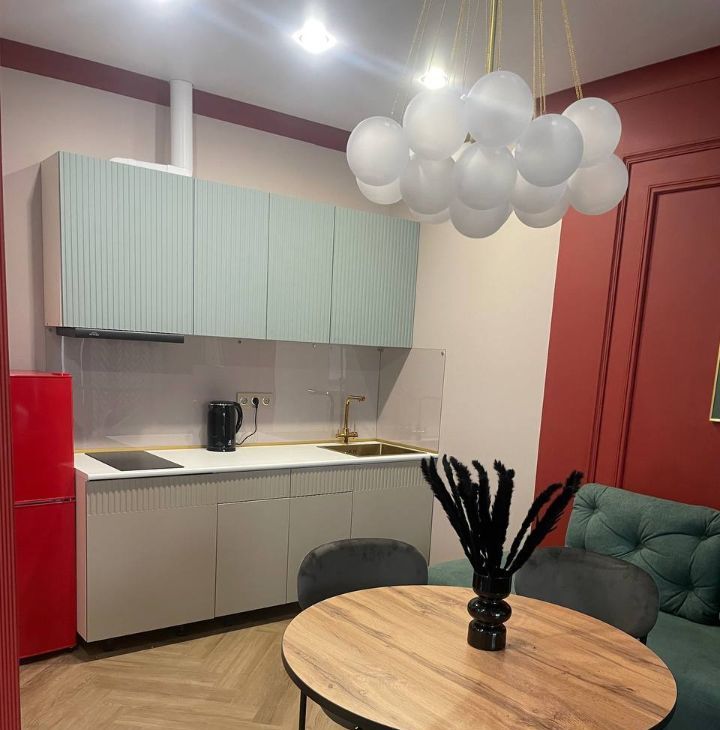 Холодильник и СВЧ-печь, варочная панель, духовка, чайник, красивая посуда