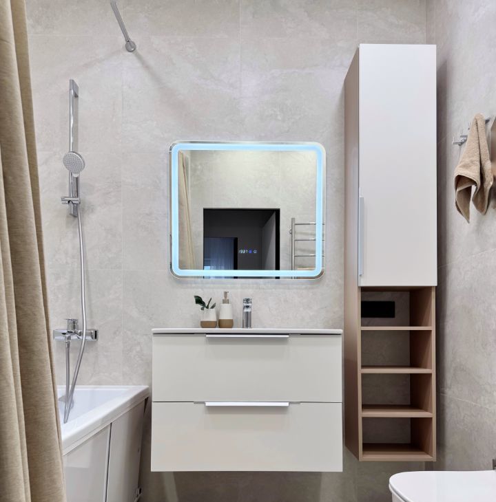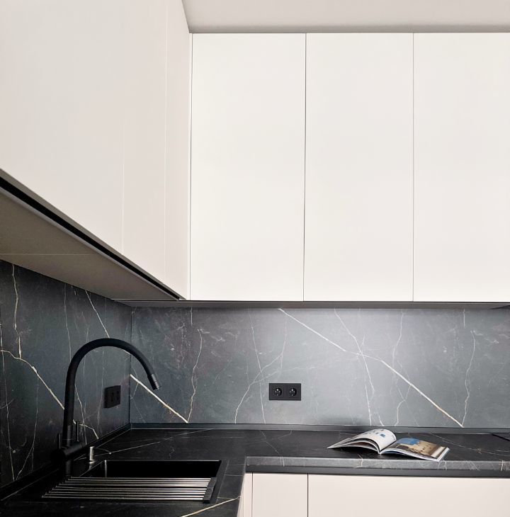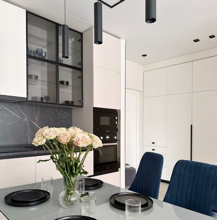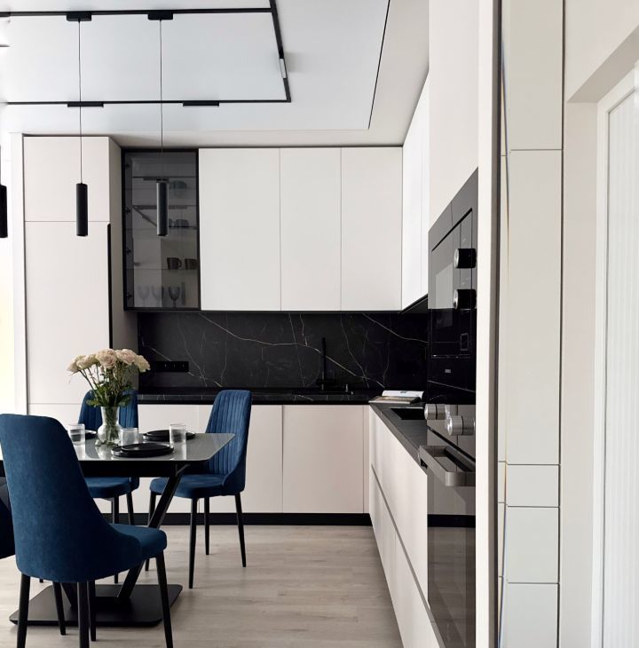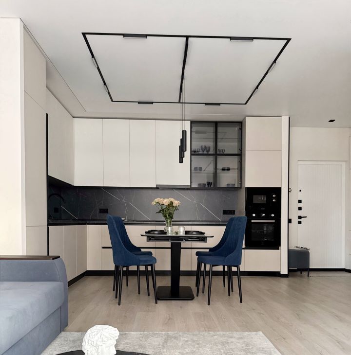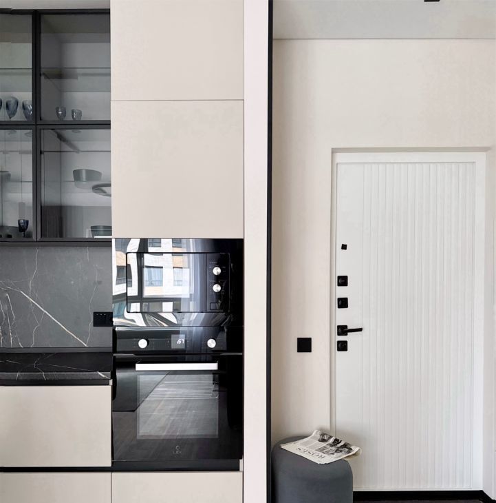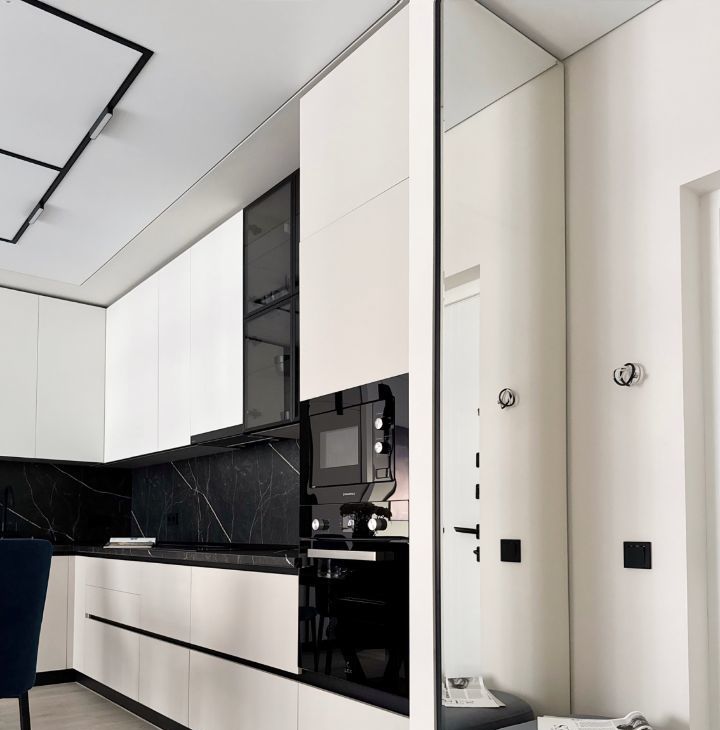 Бытовая техника: холодильник, варочная панель, электрический чайник, утюг, микроволновая печь, стиральная машина, посудомоечная машина, кондиционер, телевизор.