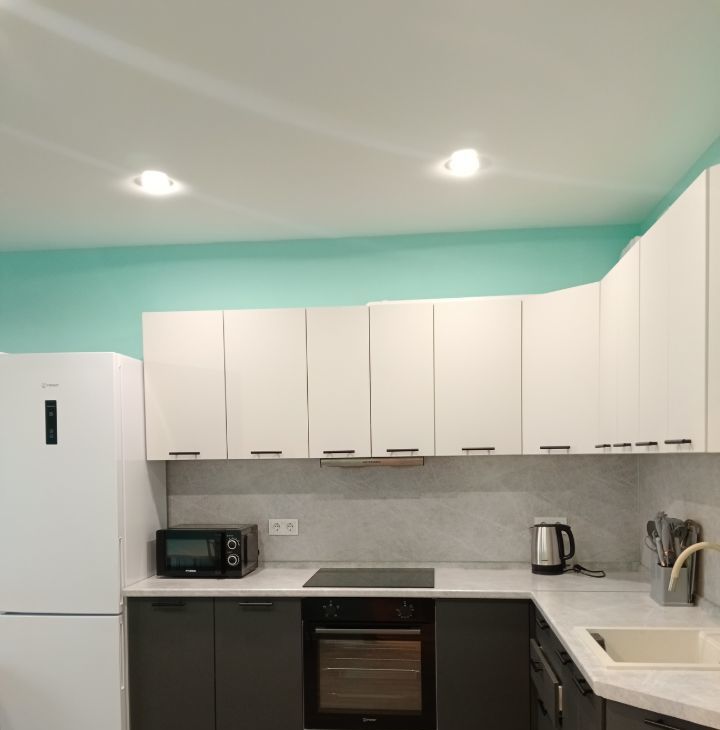 Кухня -гостиная 16 м : качественный кухонный гарнитур со встроенной варочной поверхностью и духовым шкафом Индезит, вытяжка, новый холодильник Индезит , мойка из камня, СВЧ, чайник, посуда.