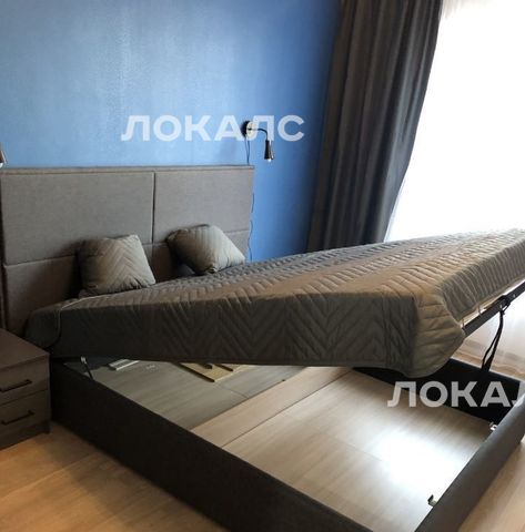 В спальне двуспальная кровать с подъемным механизмом, шкаф, тумбы.