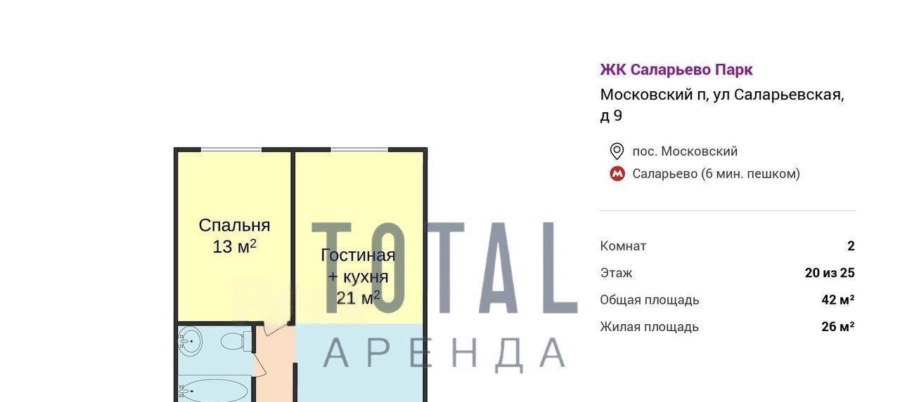 Сдаётся уютная двухкомнатная квартира с евроремонтом на Саларьевской улице, дом 9. Общая площадь квартиры составляет 42 кв. м, жилая площадь — 26 кв. м, а кухня — 8 кв. м. Квартира расположена на 20-м этаже 25-этажного монолитного дома, построенного в 2020 году. Высота потолков — 2,64 метра. Окна выходят во двор, что обеспечивает тишину и комфорт.