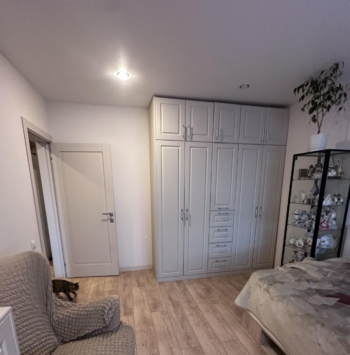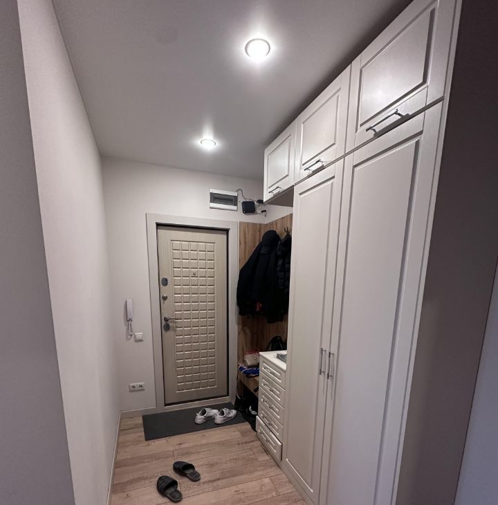 В комнате шкаф и комод сделанный на заказ прихожая также сделана на заказ.