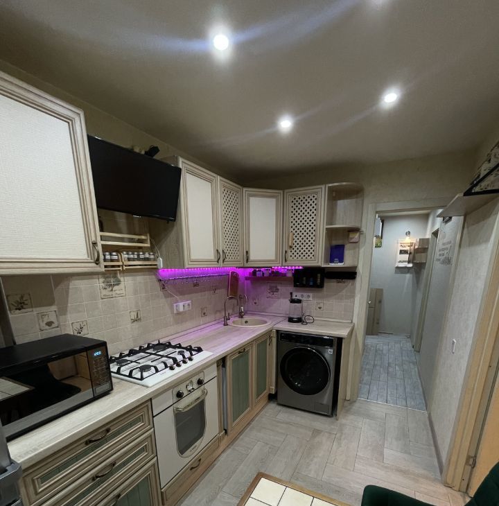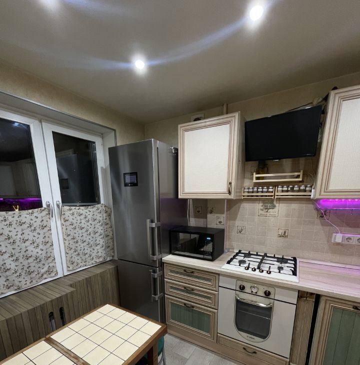 — Кухня: холодильник Liebherr No Frost, варочная панель (газ), духовой шкаф, ПММ, стиральная машина LG с сушкой, фильтр воды, микроволновка, чайник, телевизор.
