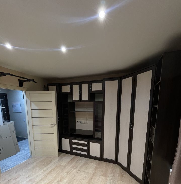 — Гостиная: раскладной диван, рабочее место, проектор, шкафы.