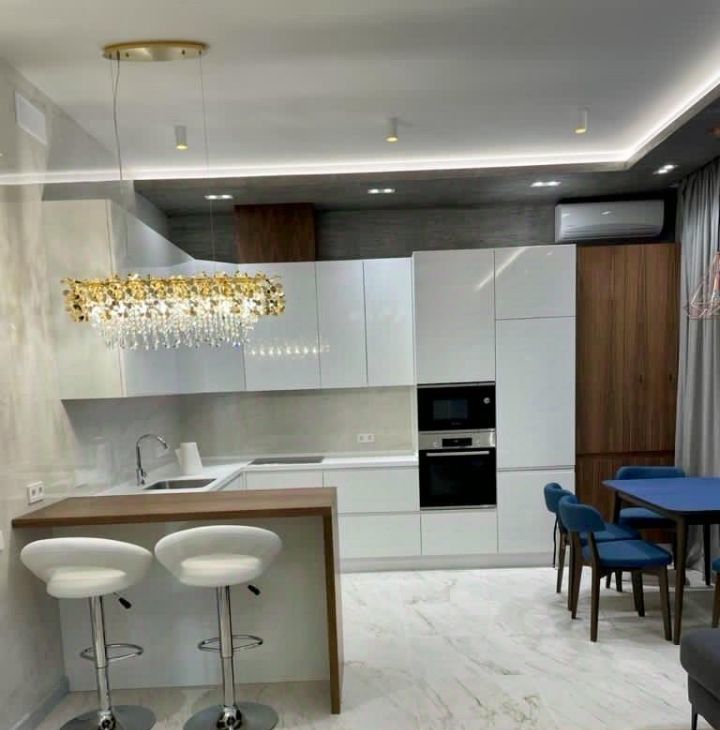 • Гостиная, совмещённая с кухней, оснащенной новейшей бытовой техникой ведущих брендов