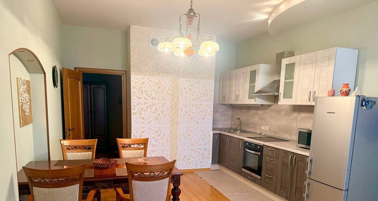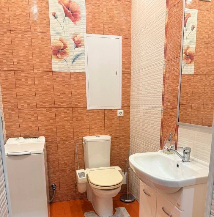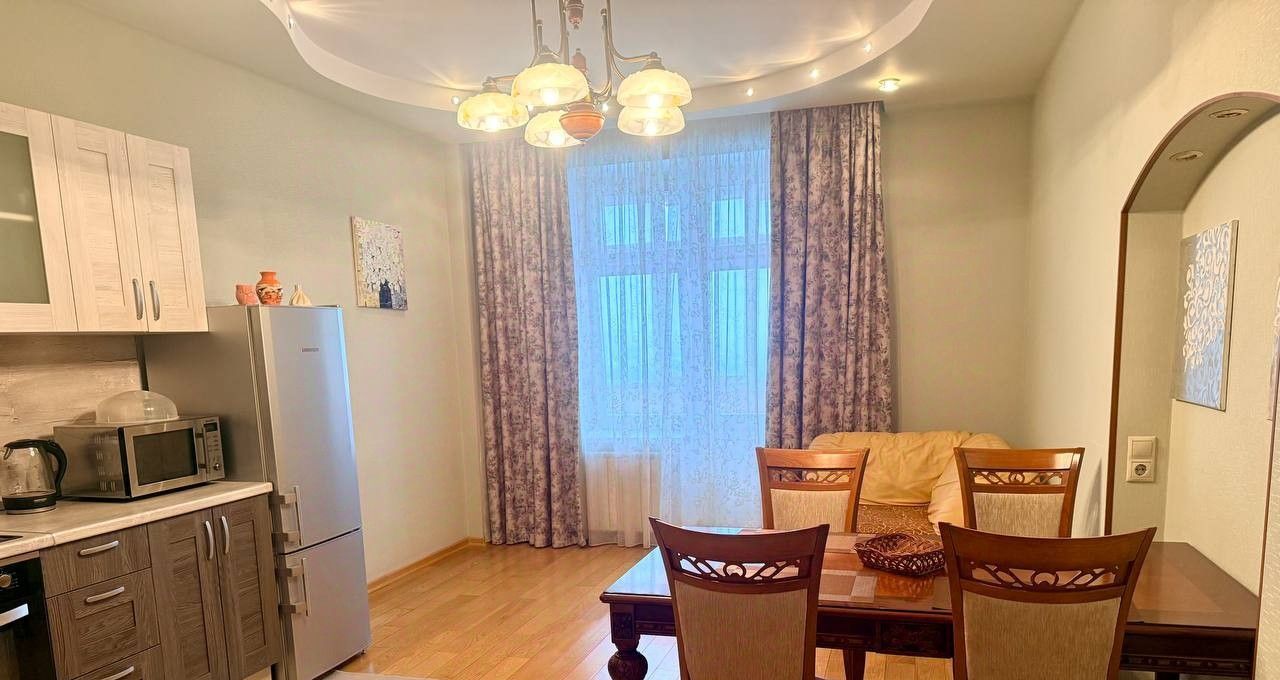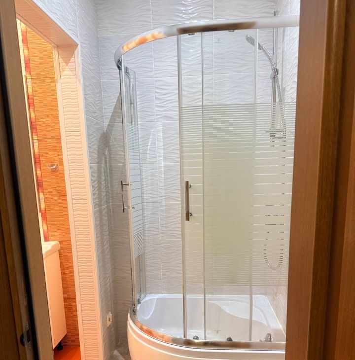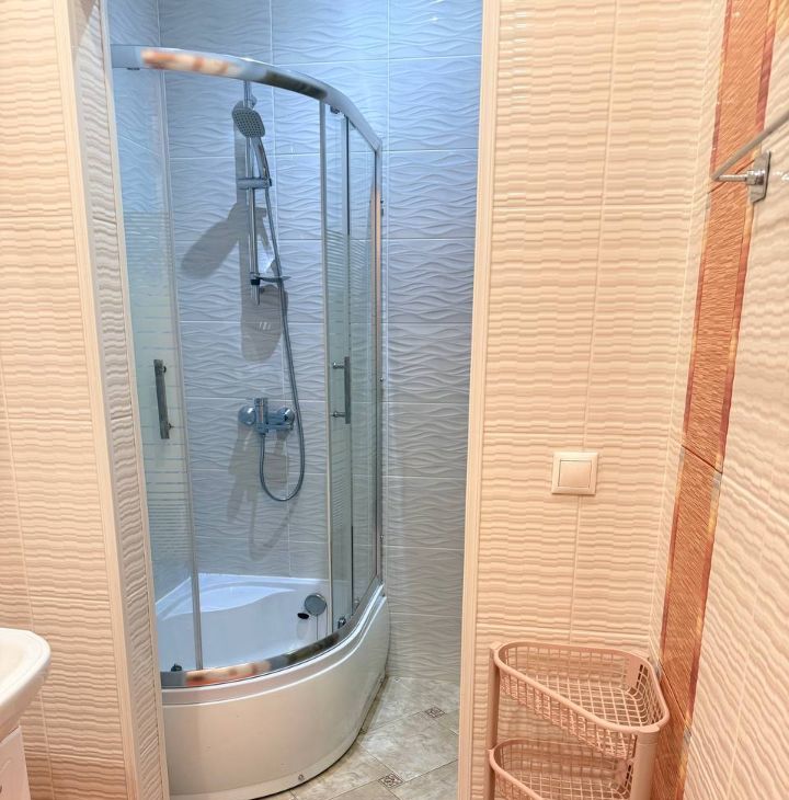 Квартира радует современным евроремонтом и рациональной планировкой. В наличии просторная кухня площадью 25 кв. м, где есть вся необходимая мебель и техника: кондиционер, холодильник, телевизор и стиральная машина. Жилая площадь составляет 22 кв. м, и окна выходят во двор, поэтому в квартире тихо и уютно. Ванная комната оборудована душевой кабиной. Также имеется одна лоджия для дополнительного удобства.