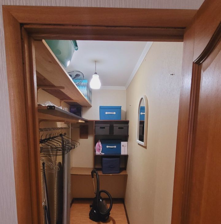 Большая комната с балконом (он не застеклен): диван-кровать (140х200), рабочее место для комфортной работы, стеллаж, кофейный столик, тумба. Из кладовки мы сделали вместительную гардеробную с широкими полками и рейлом для одежды.