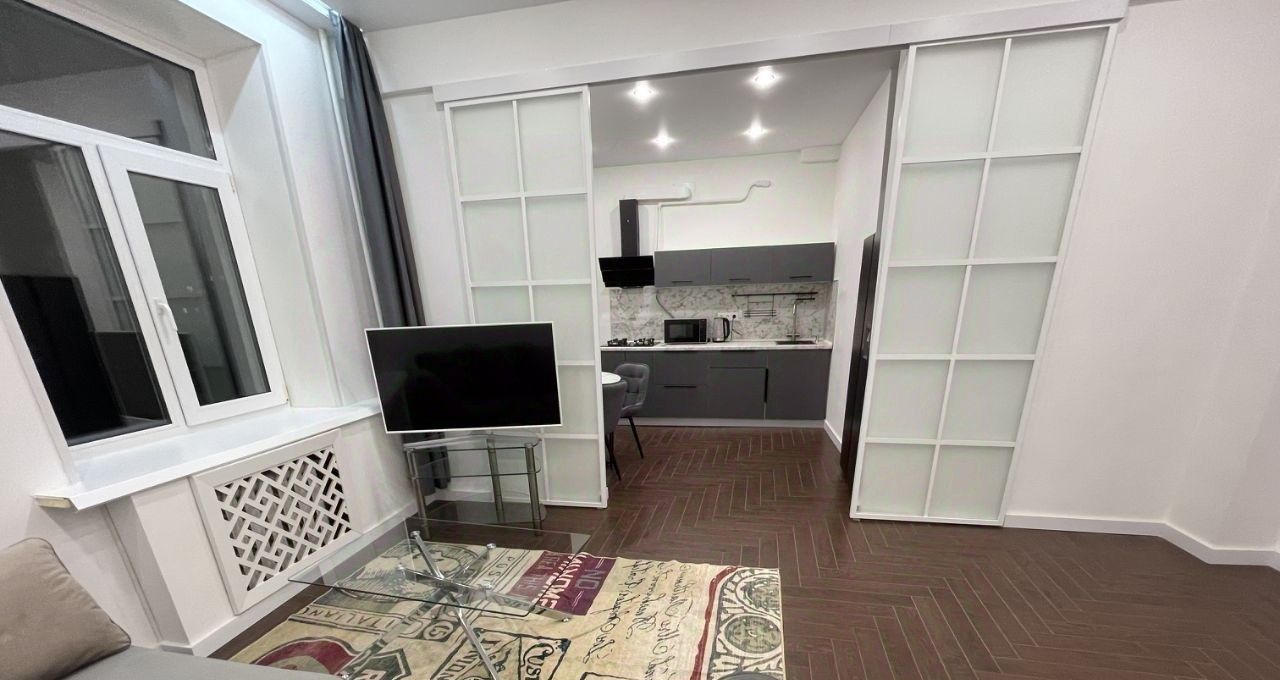 просторные комнаты - спальня и гостиная совмещенная с кухней по 30 квадратных метров. Закрытая парковка - во дворе за шлагбаумом.