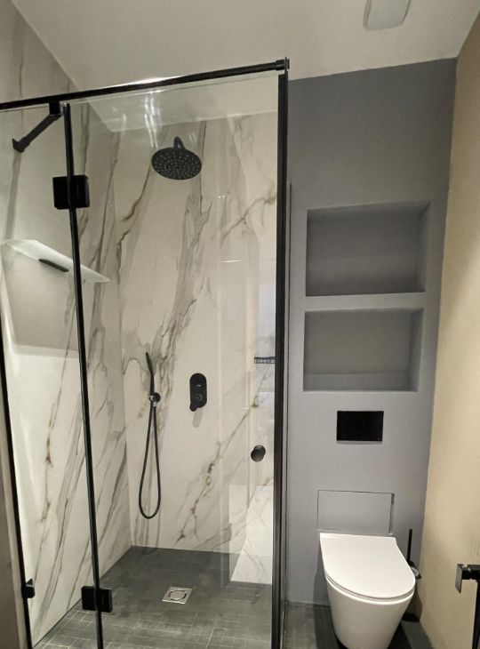 Совмещенный, оборудован душевой кабиной, раковиной, стиральной машиной и зеркалом с подсветкой. В санузле теплый пол.