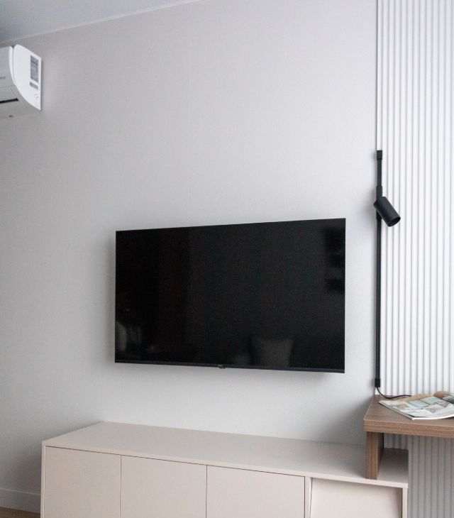 В зоне гостиной раскладной диван, тв зона и полноценное рабочее место.