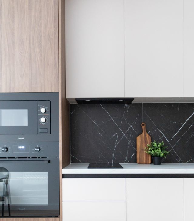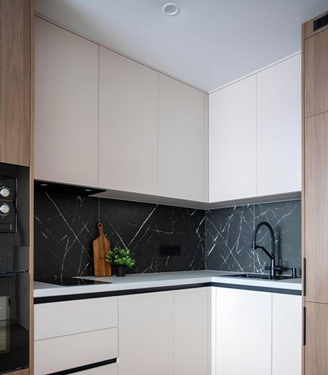Кухня-гостиная: новая функциональная кухня со встроенной бытовой техникой и обеденная зона с раскладным столом.