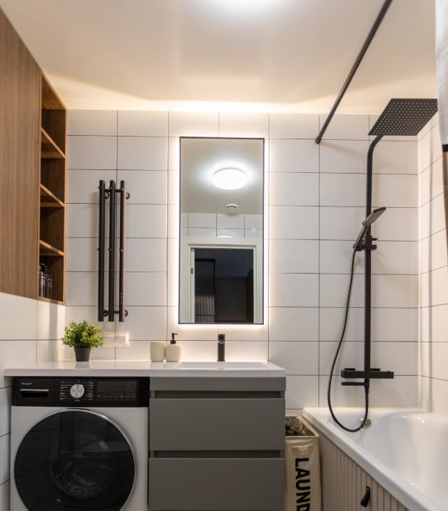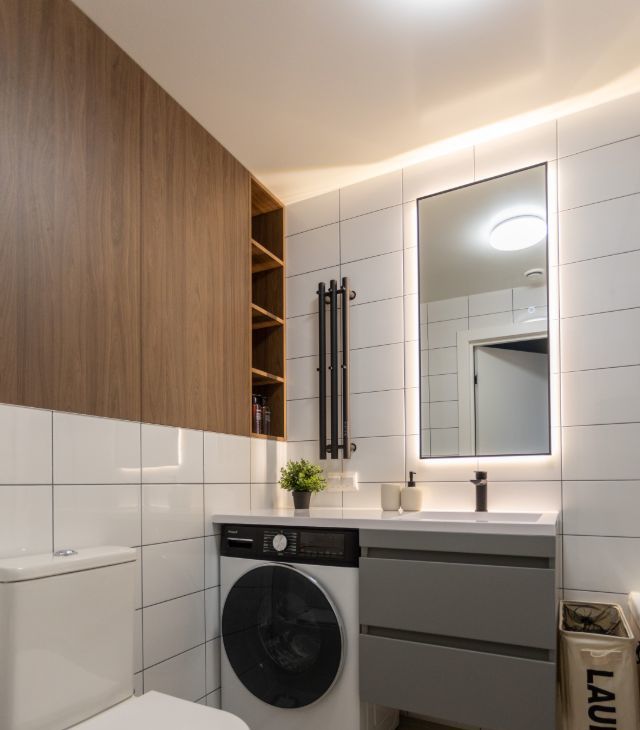 Санузел: ванна, тумба с раковиной , шкаф с хранением и стиральная машинка с сушкой