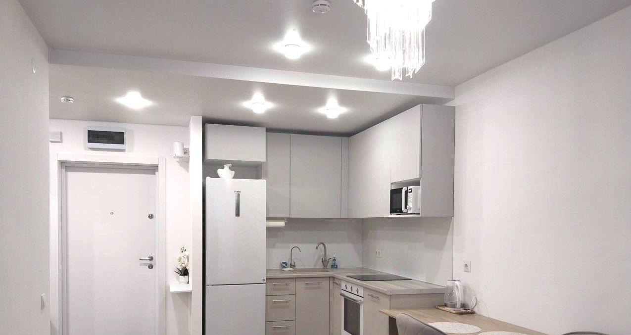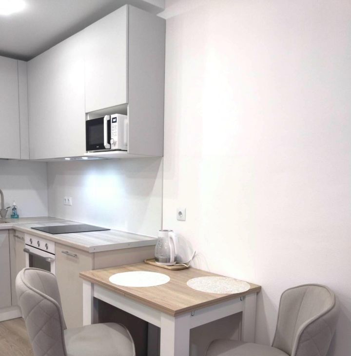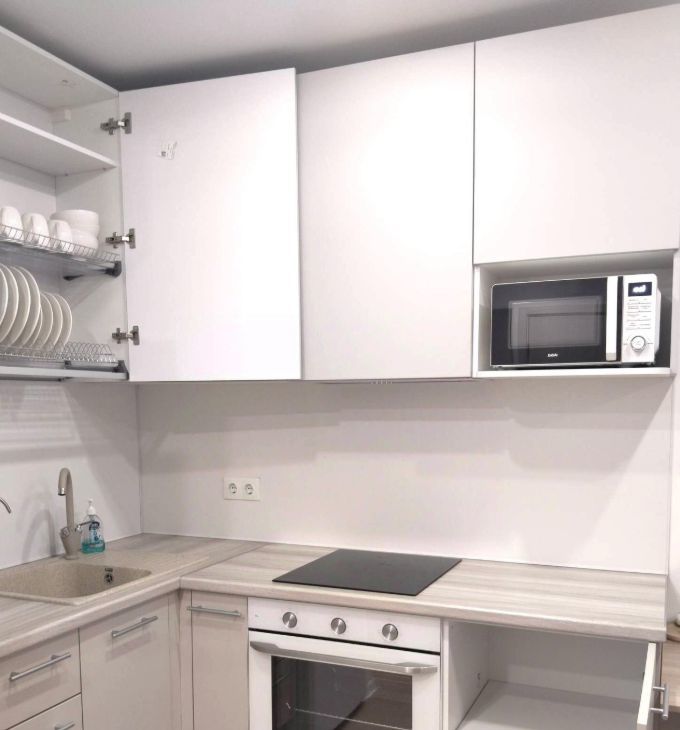 - гостинная с кухонной зоной - двуспальный диван, комод, телевизор, раздвижной обеденный стол с креслами, кухонный гарнитур со встроенной техникой (варочная панель, духовой шкаф), холодильник, СВЧ-печь, фильтр для воды.