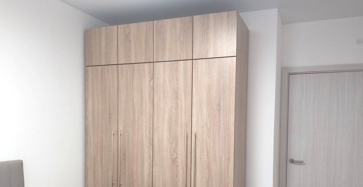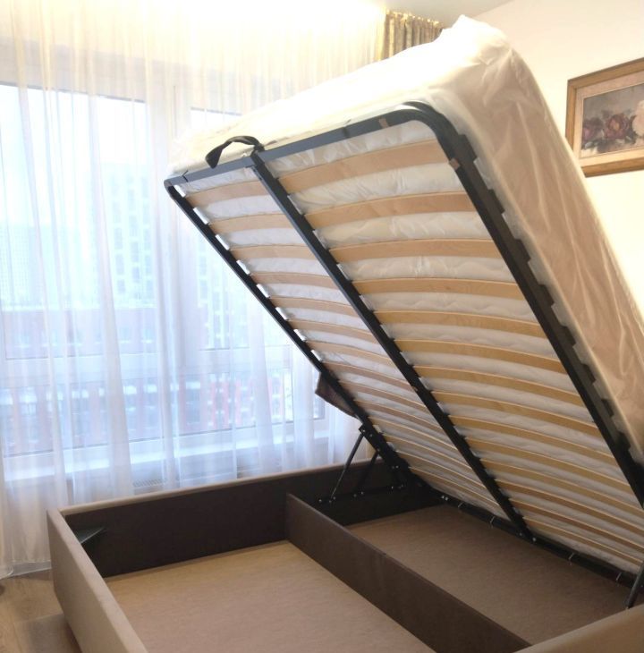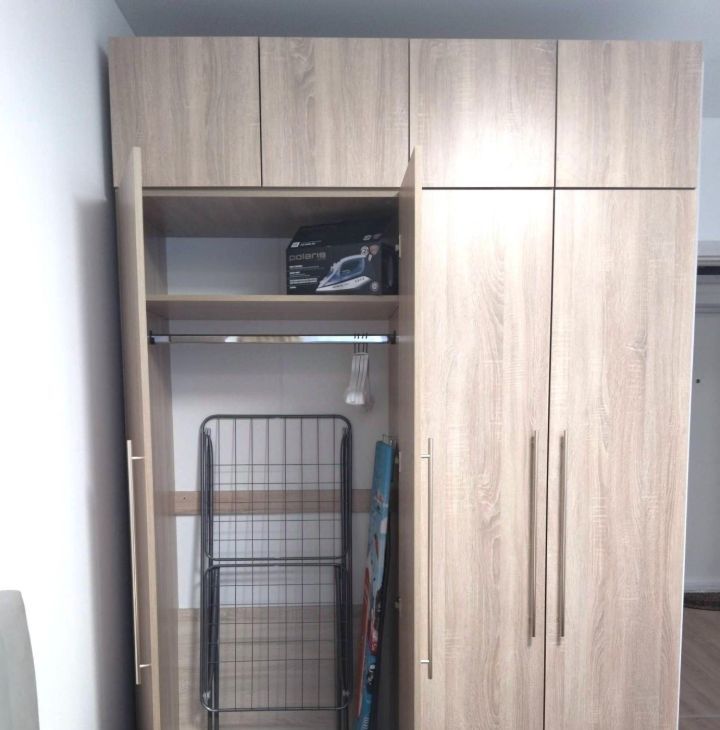 -Спальня - двуспальная кровать с подъемным механизмом, четырехстворчатый шкаф для хранения одежды и вещей, компьютерный столик;