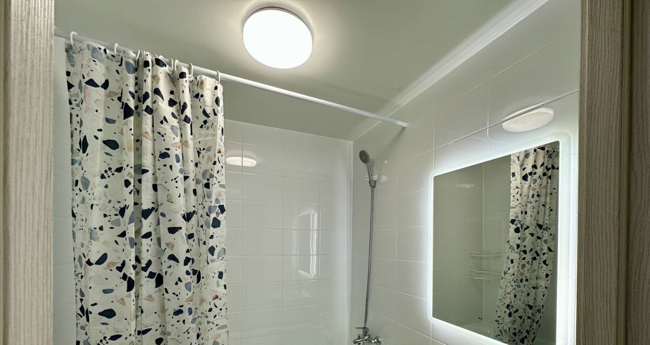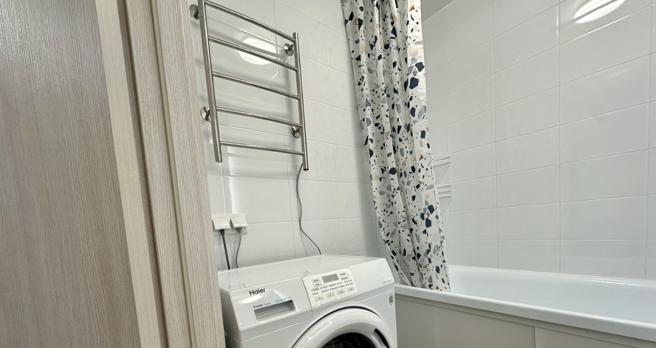 В санузле 1: ванная, раковина, стиральная машина, полотенцесушитель электрический, зеркало с подсветкой.