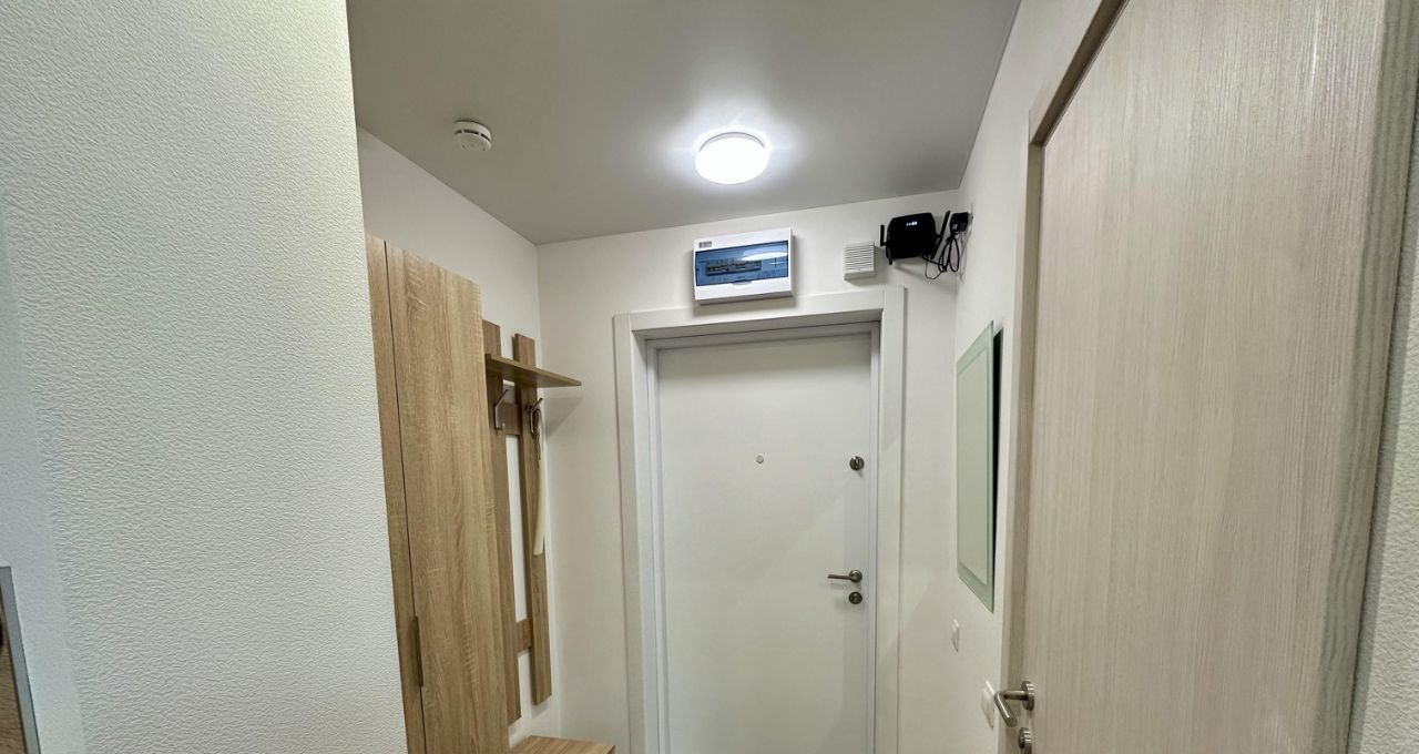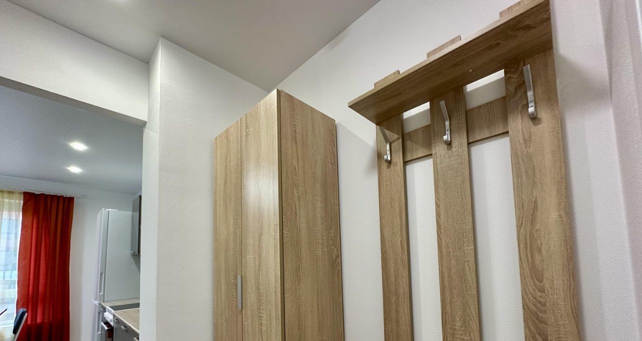 В прихожей: шкаф для одежды, вешалка для одежды, зеркало, коврик для обуви, роутер.