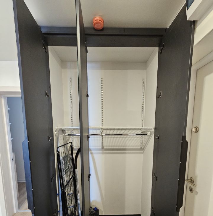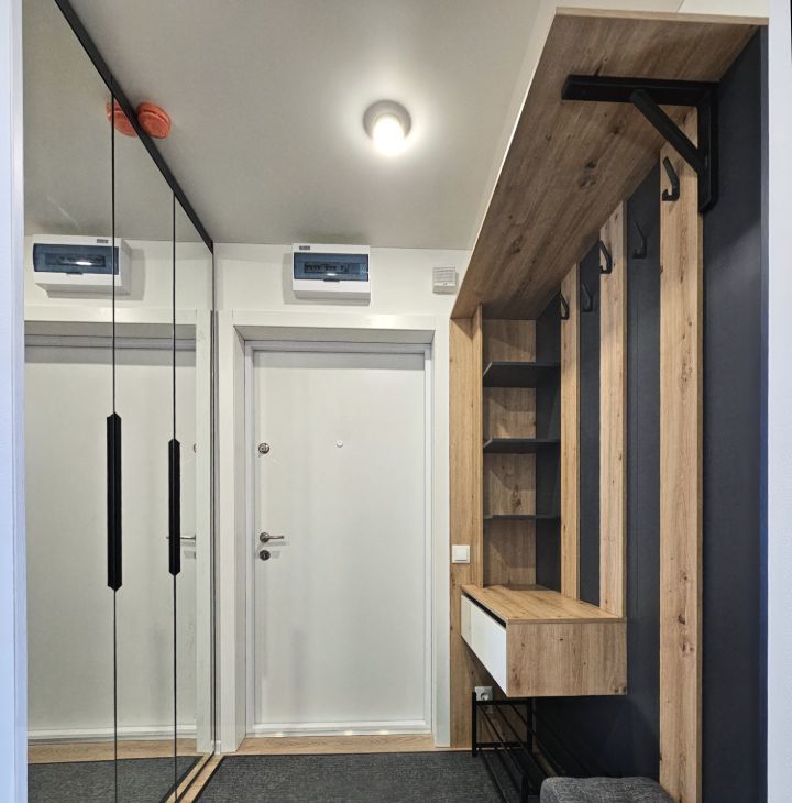 Продуманное хранение отдельный гардероб с гибкой системой хранения (можно переставлять полки по желанию), комод, большой шкаф в прихожей с зеркалами и открытая вешалка, пространство под кроватью и диваном, высокие вместительные шкафы кухни, тв-консоль, стеллаж.