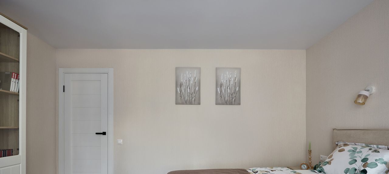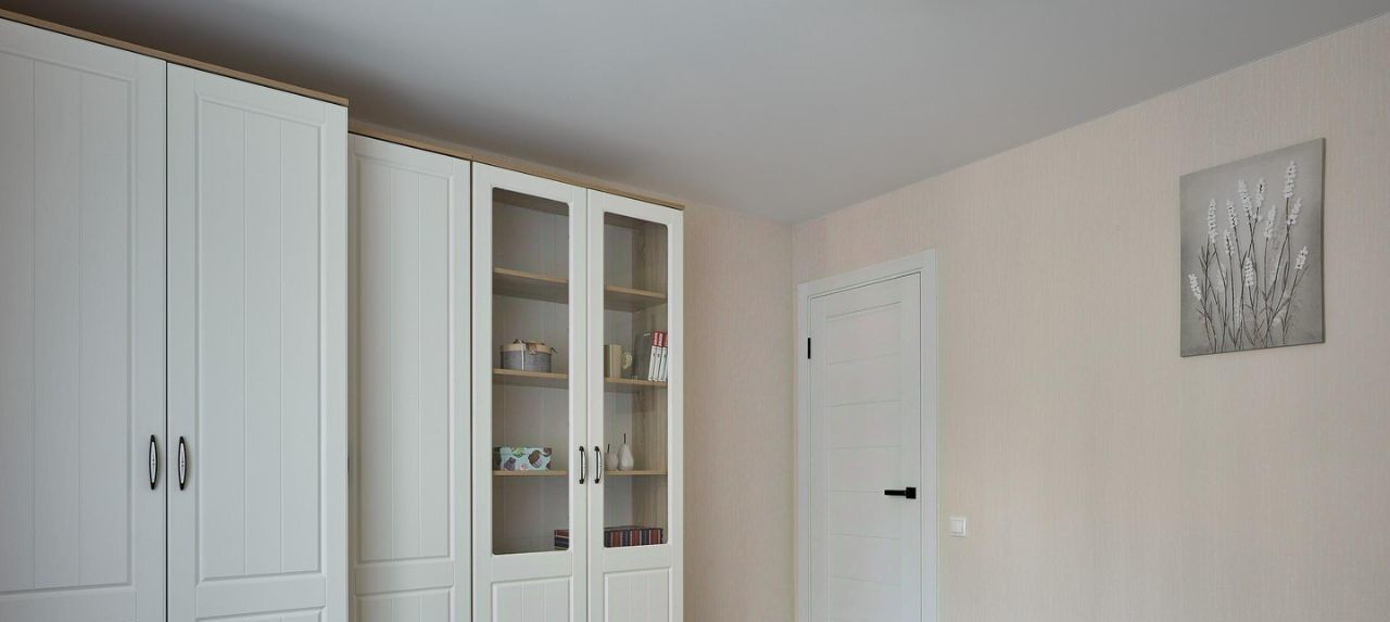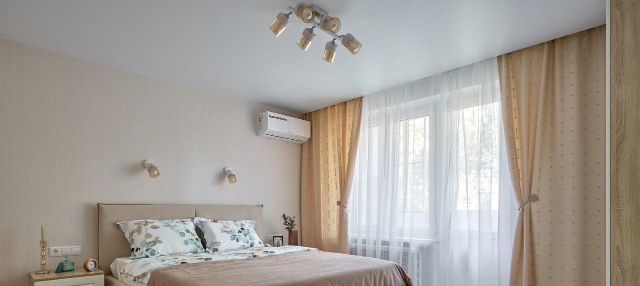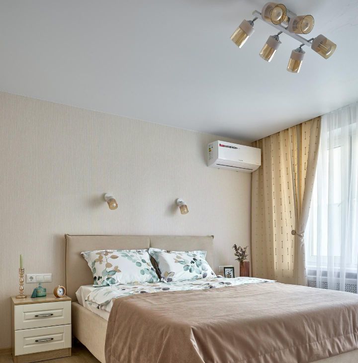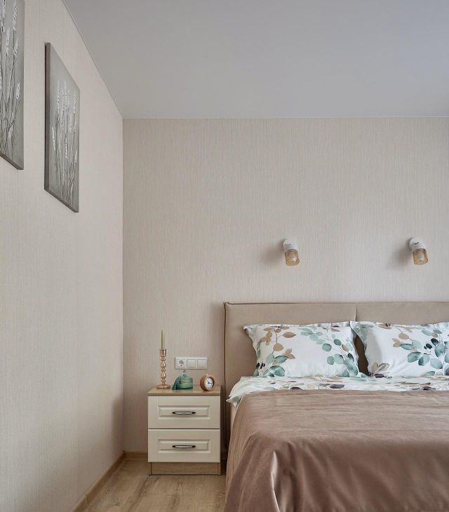 В спальне расположена двуспальная кровать с подъемным механизмом, позволяющим использовать пространство под ней в качестве дополнительной зоны хранения, а также шкаф с полками и рейлингами.