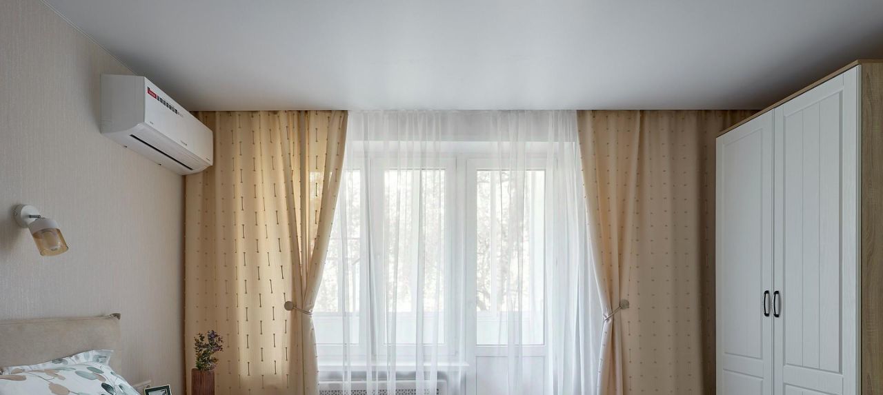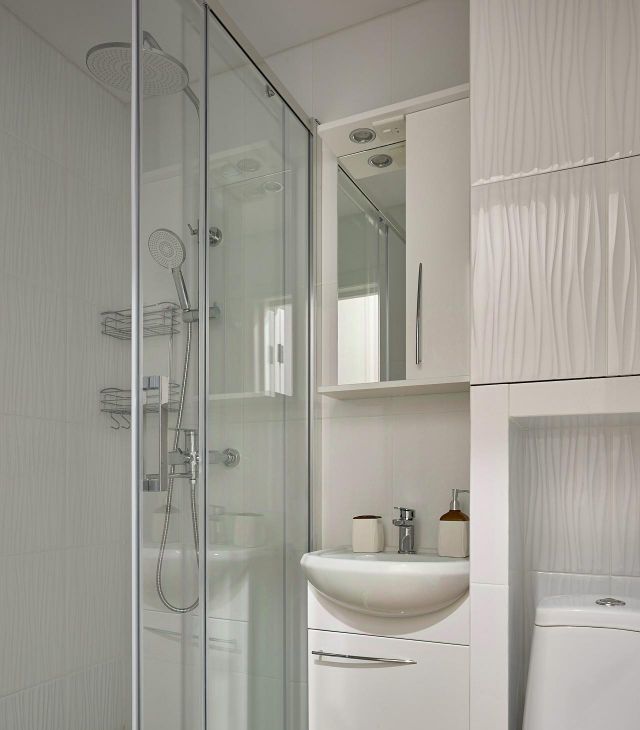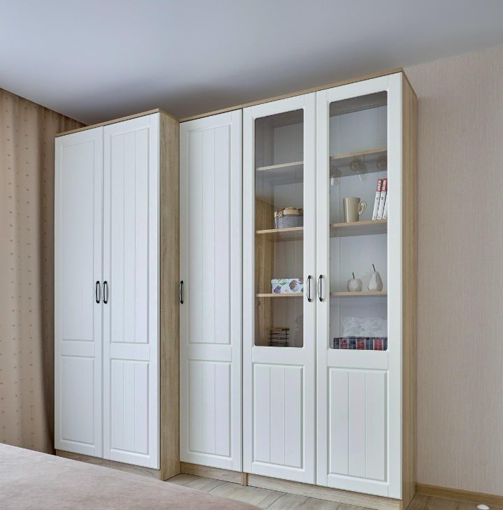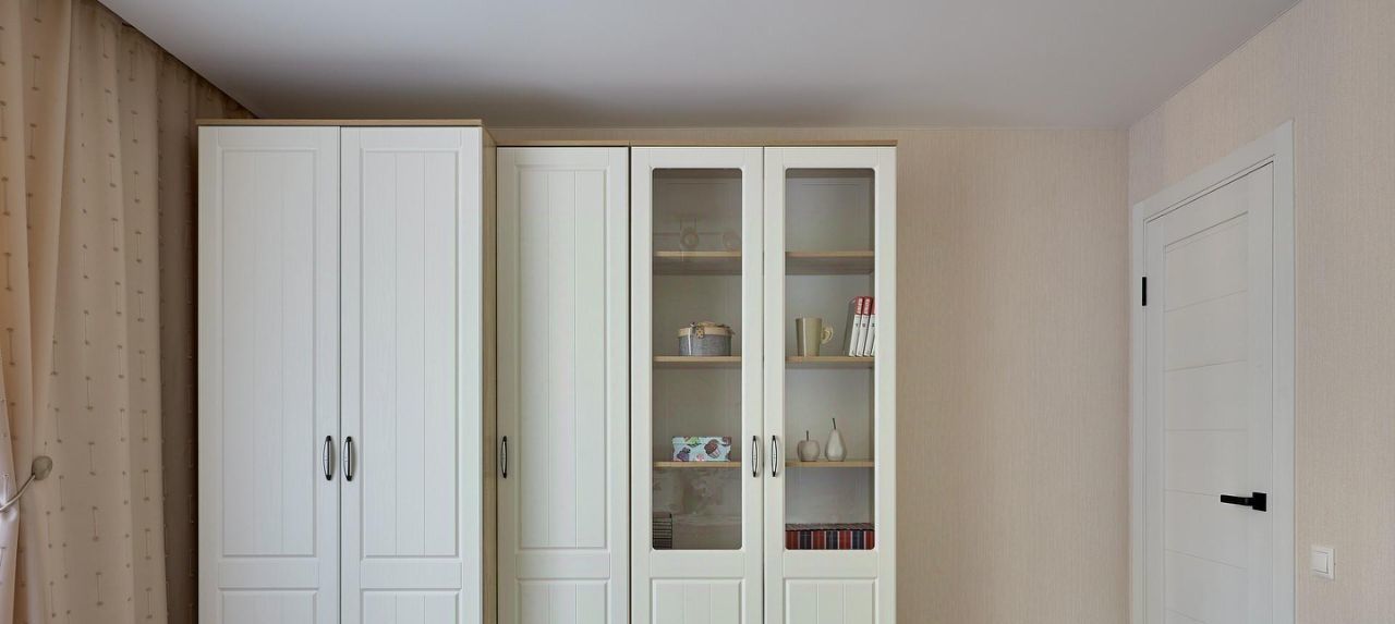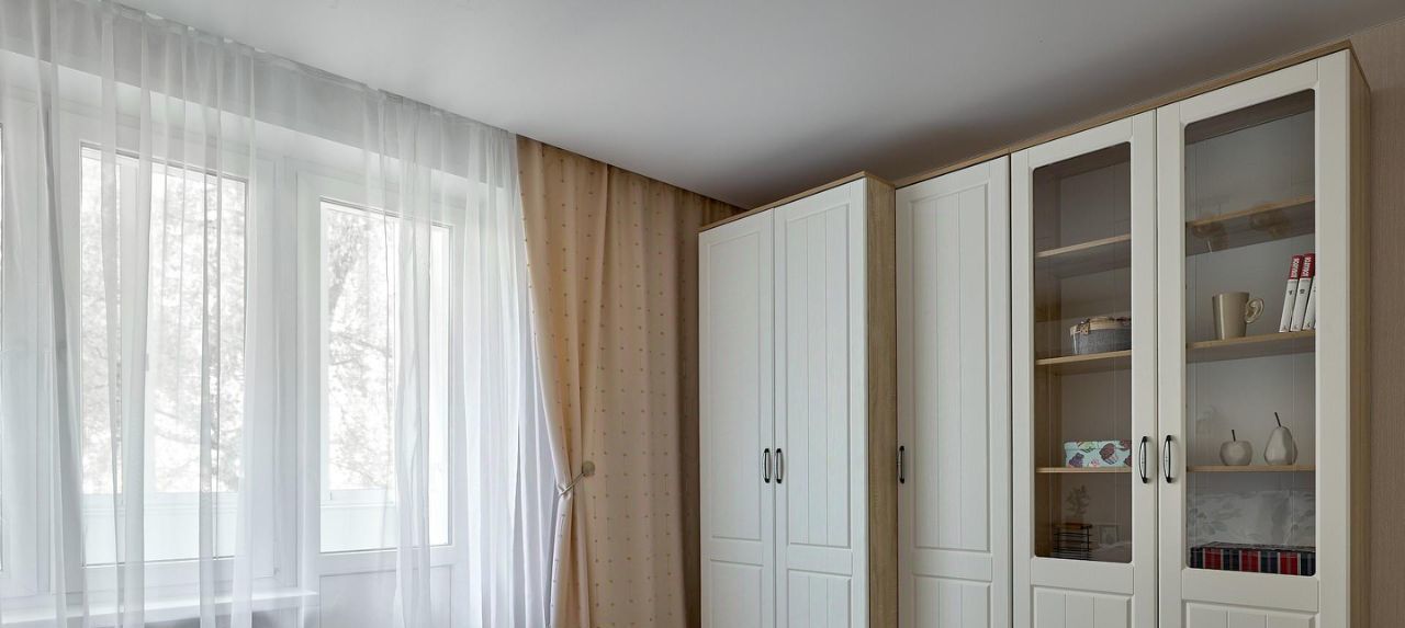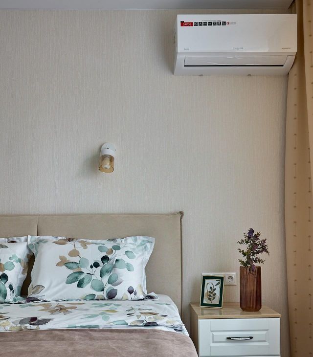 В спальне расположена двуспальная кровать с подъемным механизмом, позволяющим использовать пространство под ней в качестве дополнительной зоны хранения, а также шкаф с полками и рейлингами.