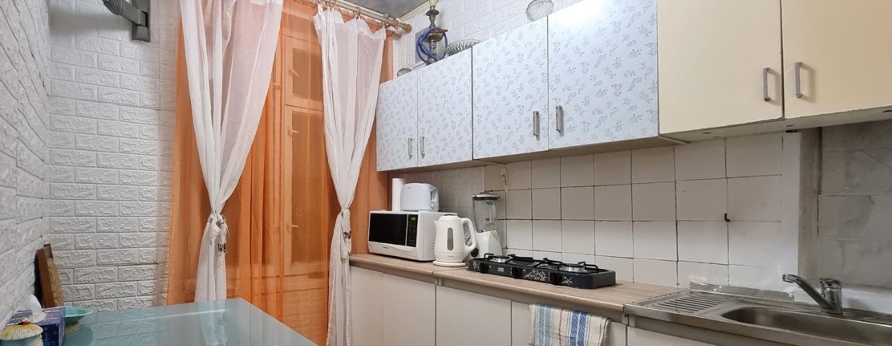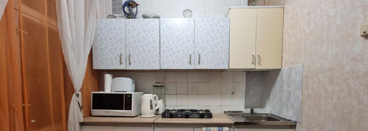 • Кухня (уютная, компактная 5,5 кв.м ): гарнитур, встроенная газовая панель (2 конфорки), СВЧ-печь, чайник, блендер, тостер, стеклянный стол + 2 стула.