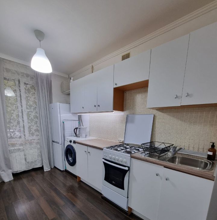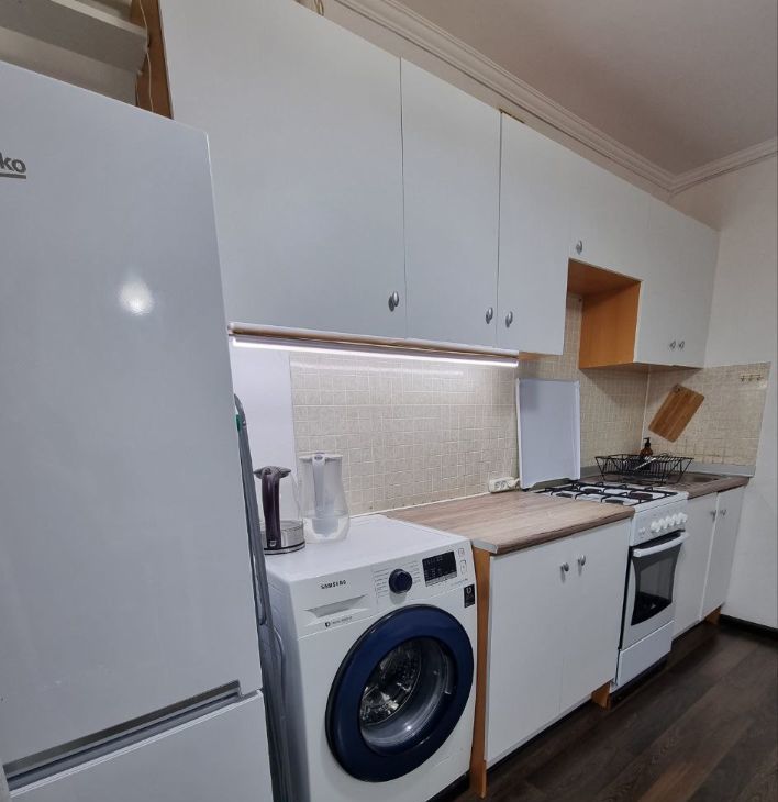 Кухня оборудована необходимой техникой, включая холодильник и стиральную машину. В гостиной установлен телевизор, а также имеется обеденный стол. В спальне — просторная кровать и вместительный шкаф. Так же имеется шкаф в прихожей