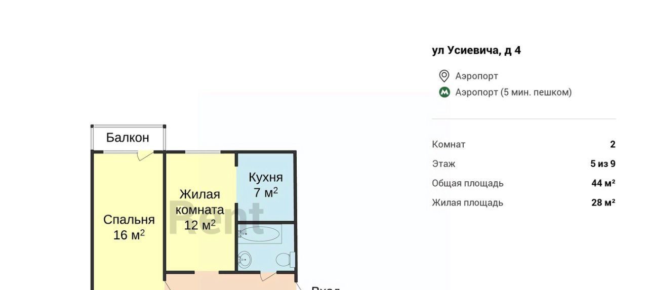 Предлагается двухкомнатная квартира рядом с метро "Аэропорт". В гостиной имеется практичный угловой диван, в спальне - удобная кровать, оборудовано место для работы за компьютером и шкаф-купе. На кухне - гарнитур, укомплектованный современной бытовой техникой, включая духовую печь и варочную панель. Есть выход на балкон. Для комфорта установлен нагреватель воды.