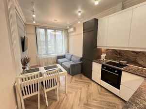 В квартире выполнен дизайнерский ремонт, создающий атмосферу уюта и современности. Высокие потолки в 3 метра добавляют пространства и света. Планировка включает кухню с мебелью и всей необходимой техникой: кондиционер, холодильник, посудомоечная машина, телевизор и стиральная машина. В комнате также есть мебель. Санузел совмещенный, оборудован современной душевой кабиной. Окна выходят как на улицу, так и во двор, обеспечивая разнообразие видов.