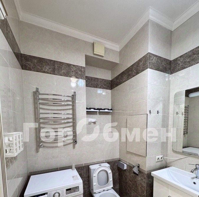 Санузел в квартире совмещённый, он оформлен в том же стиле, что и остальные помещения, и оснащён всем необходимым для удобства жильцов.
