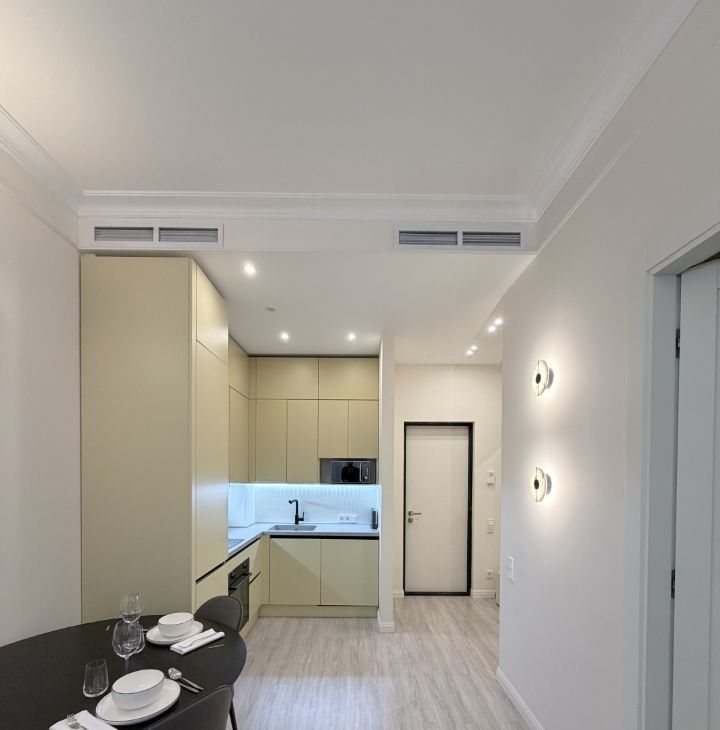 - кухонная зона оборудована необходимой бытовой техникой: варочная панель, духовая печь, свч, посудомоечная машина, вытяжка, сушилка для посуды. Мягкая подсветка кухни и необходимый инвентарь позволит сделать процесс кулинарного творчества более приятным.