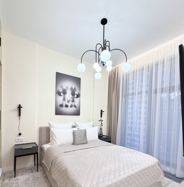 - спальня оборудована двуспальной кроватью, с телевизором, гардеробом на всю стену;