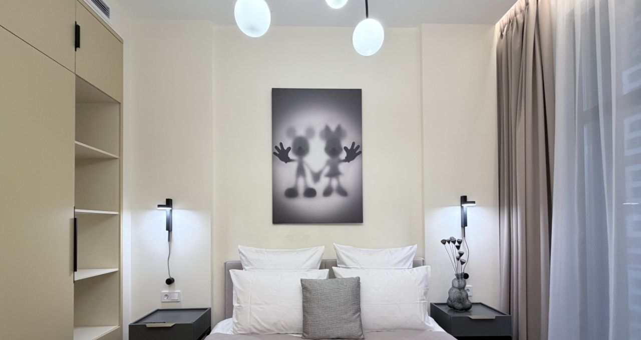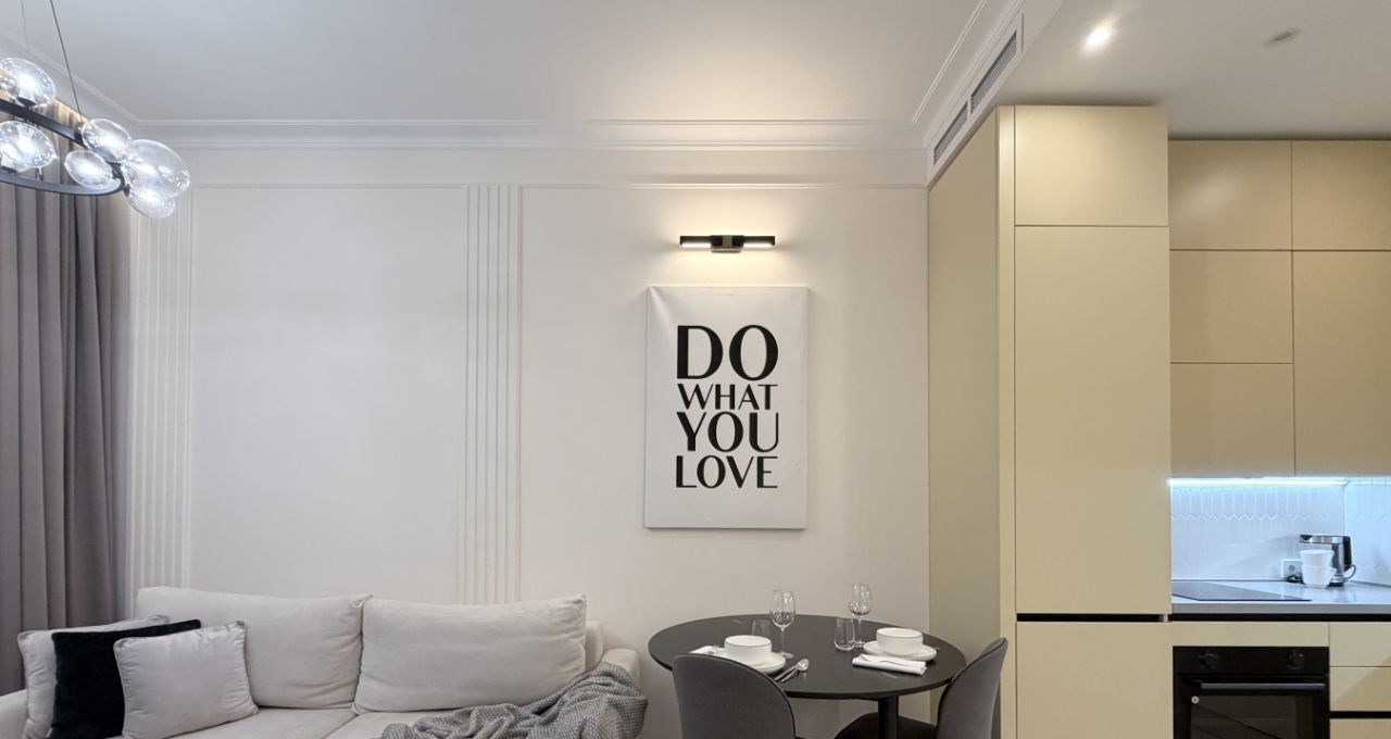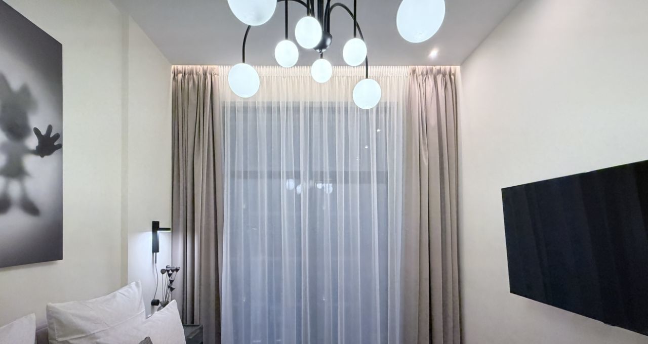 - гостиная зона оснащена раздвижным дизайнерским диваном, тв-тумбой и телевизором 55 дюймов;